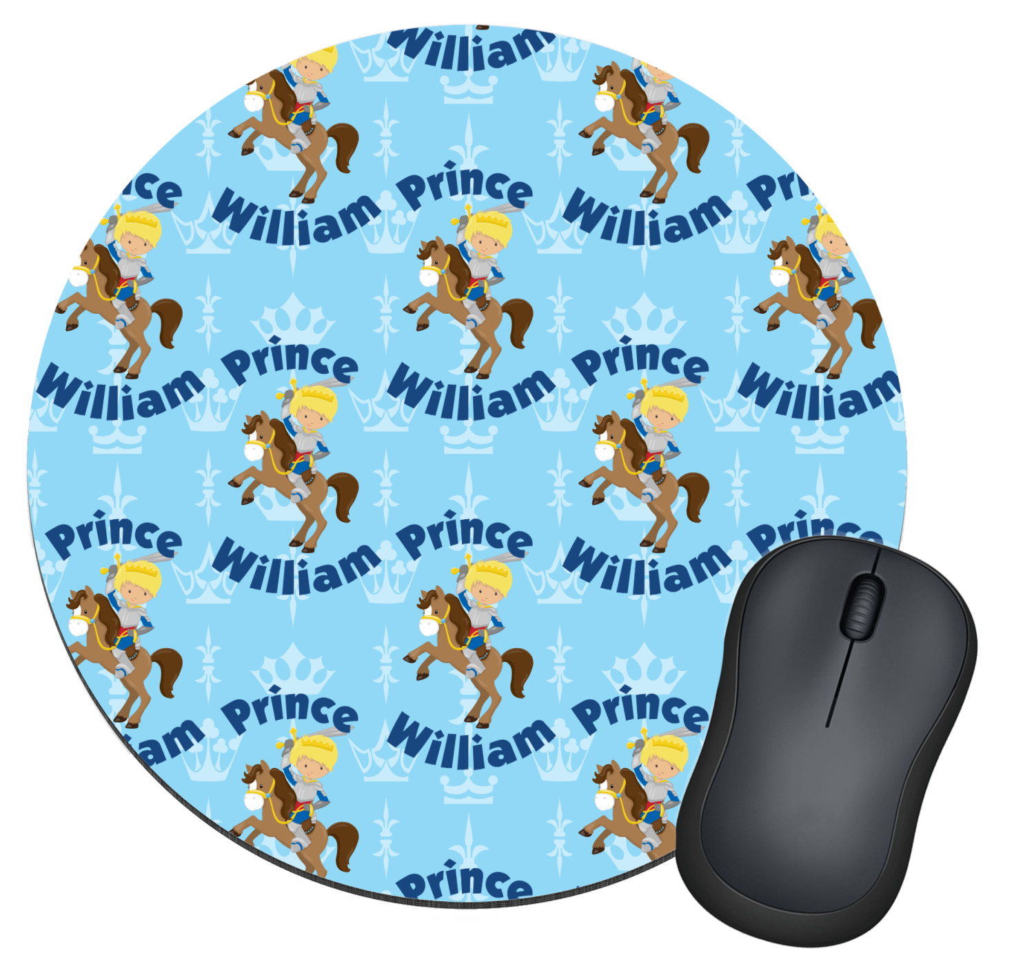 This is the perfect custom / personalized prince design for any young boy. We have created a layered pattern, where the first background is a simple tone on tone crowns pattern. We then layered it with our curved custom text and graphic, where we used "Prince" and "William" as the text and we used a graphic of a prince on horse.