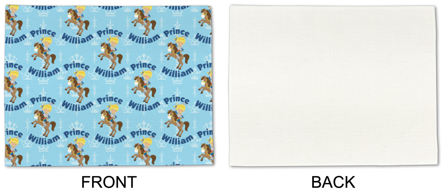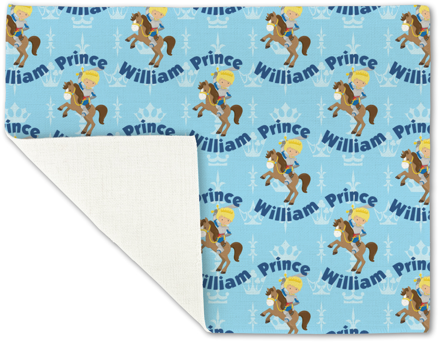 This is the perfect custom / personalized prince design for any young boy. We have created a layered pattern, where the first background is a simple tone on tone crowns pattern. We then layered it with our curved custom text and graphic, where we used "Prince" and "William" as the text and we used a graphic of a prince on horse.