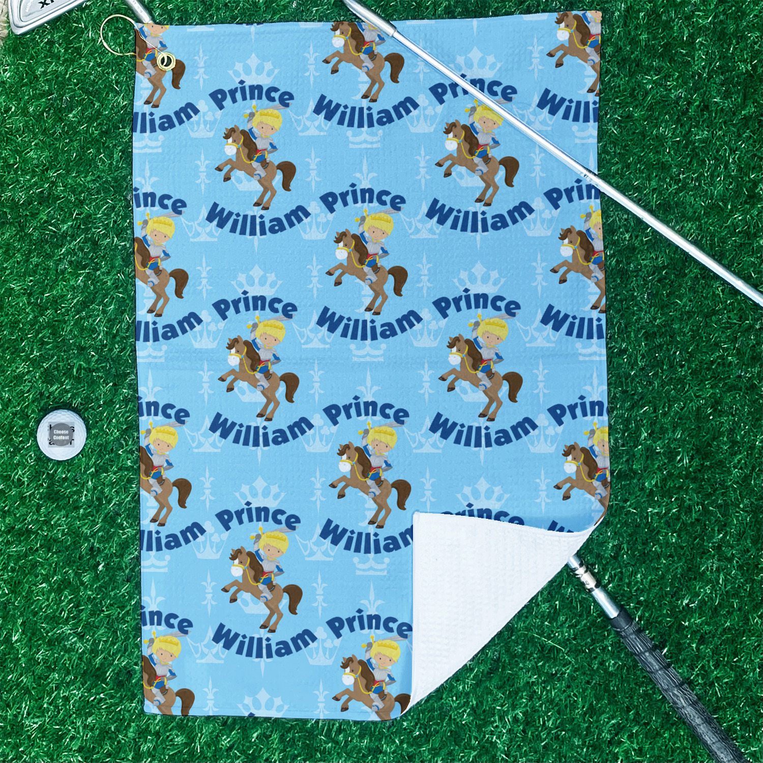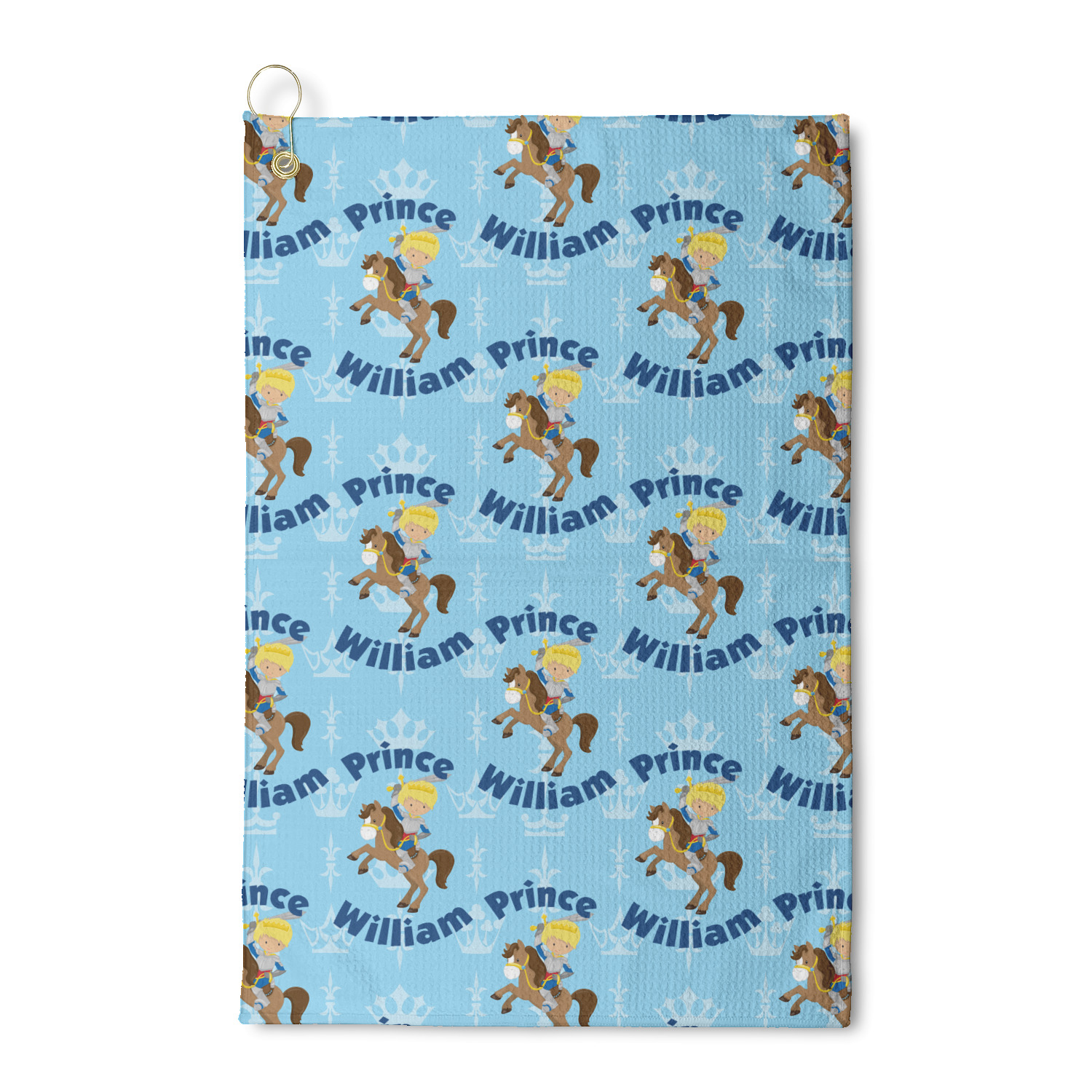 This is the perfect custom / personalized prince design for any young boy. We have created a layered pattern, where the first background is a simple tone on tone crowns pattern. We then layered it with our curved custom text and graphic, where we used "Prince" and "William" as the text and we used a graphic of a prince on horse.