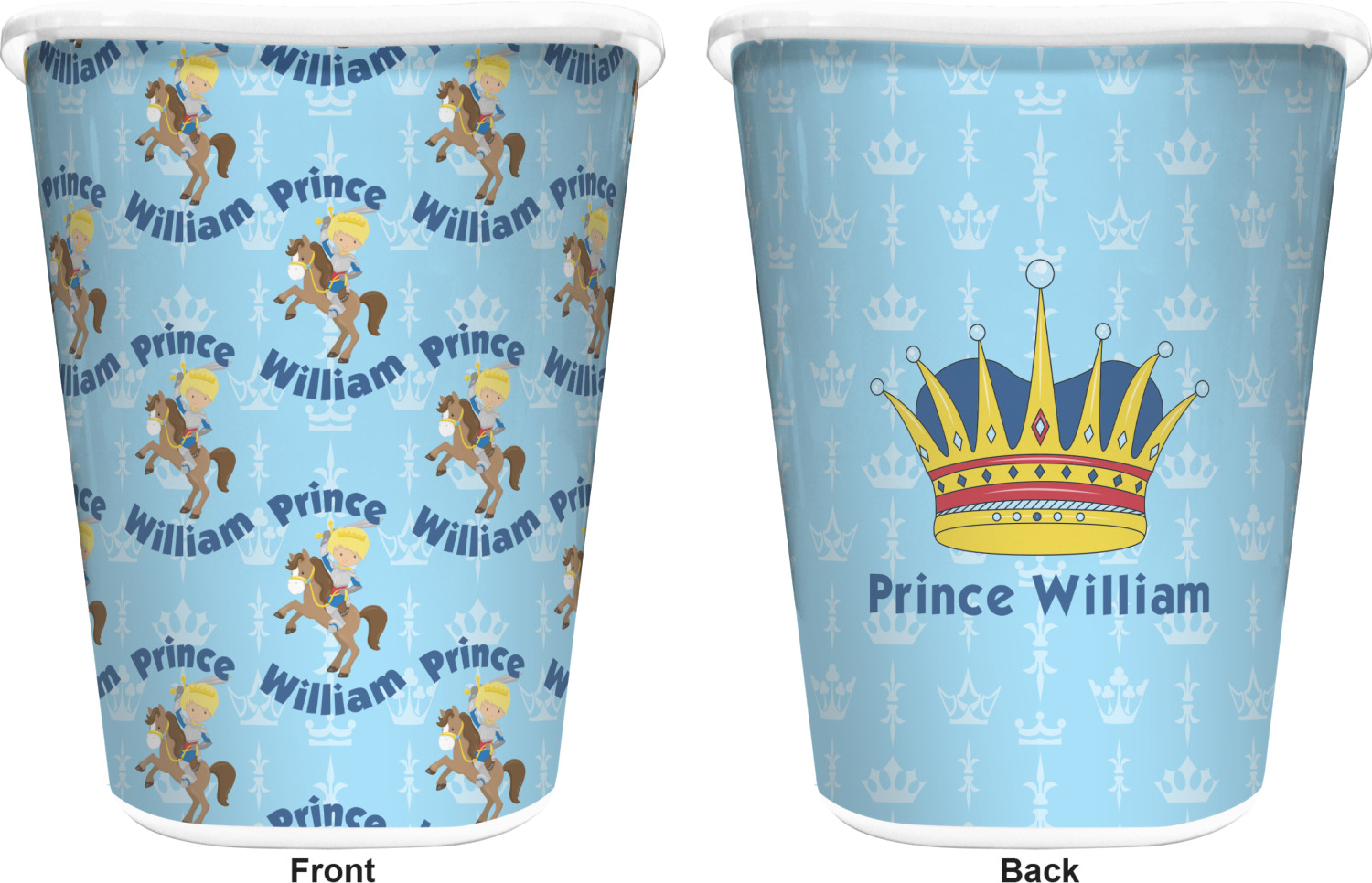 This is the perfect custom / personalized prince design for any young boy. We have created a layered pattern, where the first background is a simple tone on tone crowns pattern. We then layered it with our curved custom text and graphic, where we used "Prince" and "William" as the text and we used a graphic of a prince on horse.