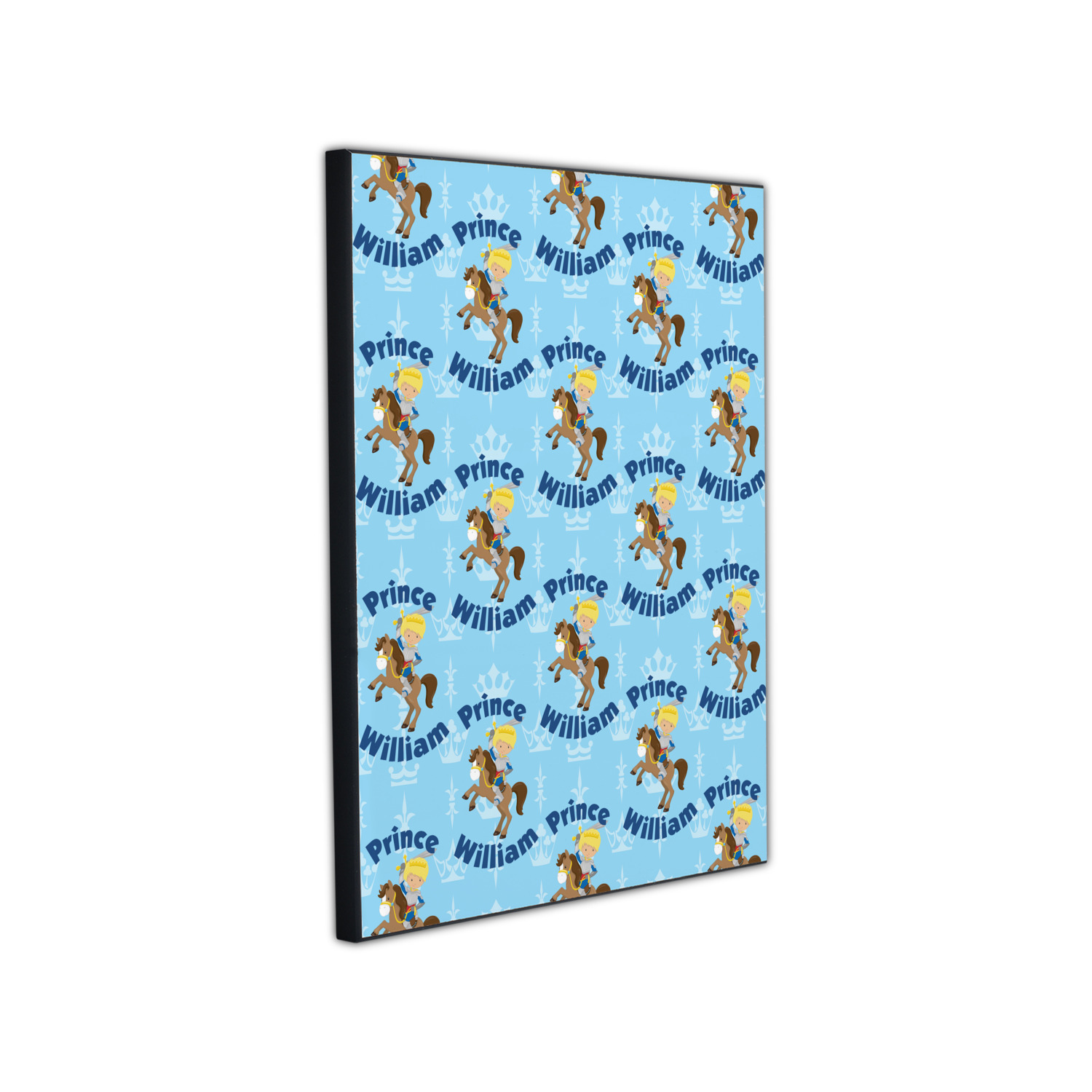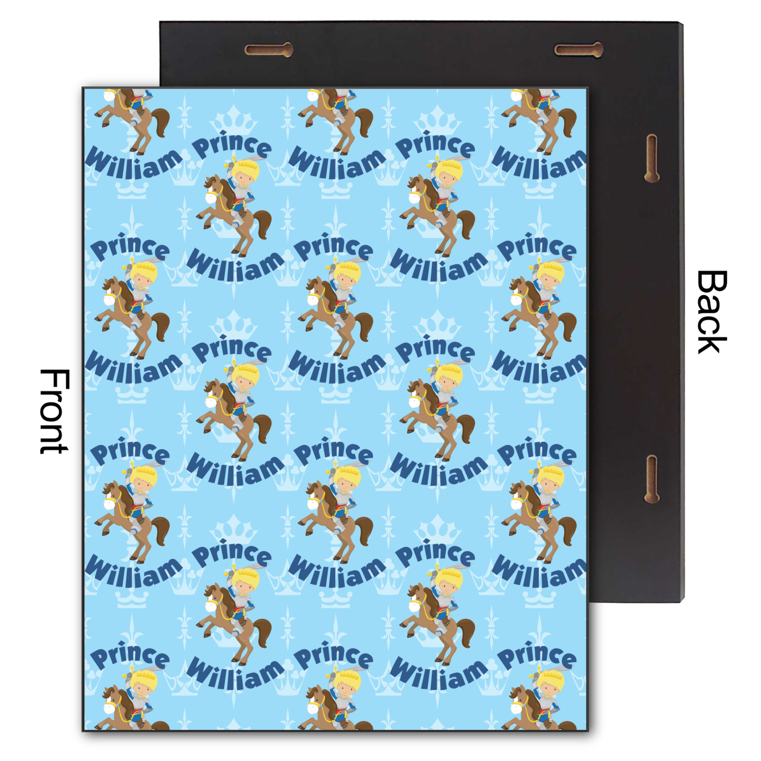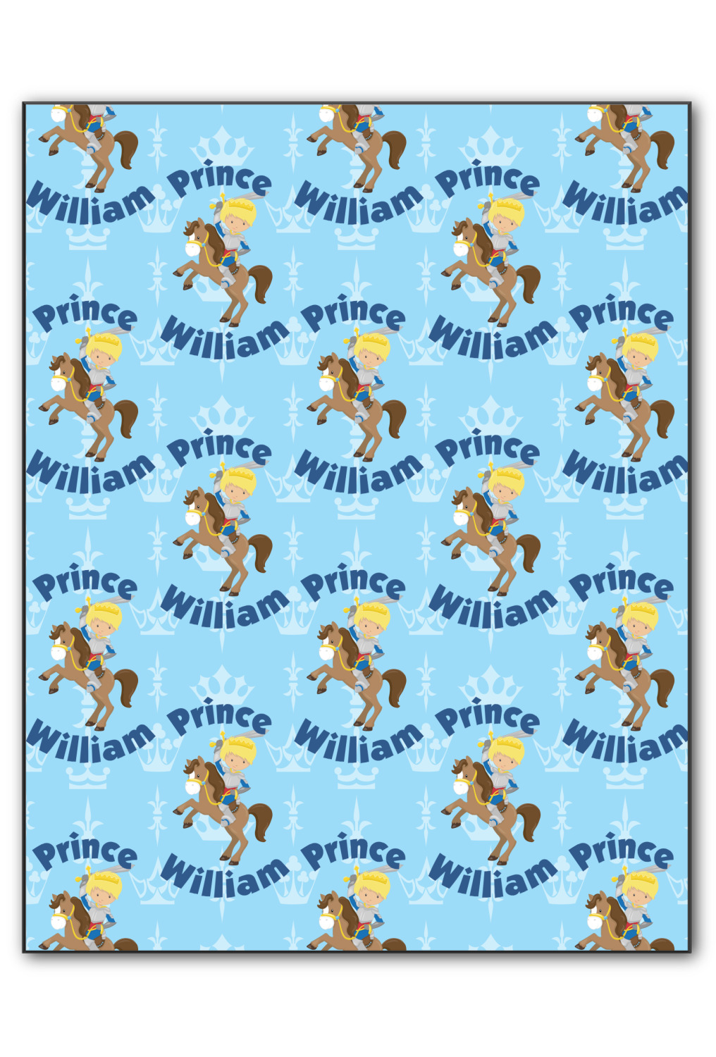 This is the perfect custom / personalized prince design for any young boy. We have created a layered pattern, where the first background is a simple tone on tone crowns pattern. We then layered it with our curved custom text and graphic, where we used "Prince" and "William" as the text and we used a graphic of a prince on horse.