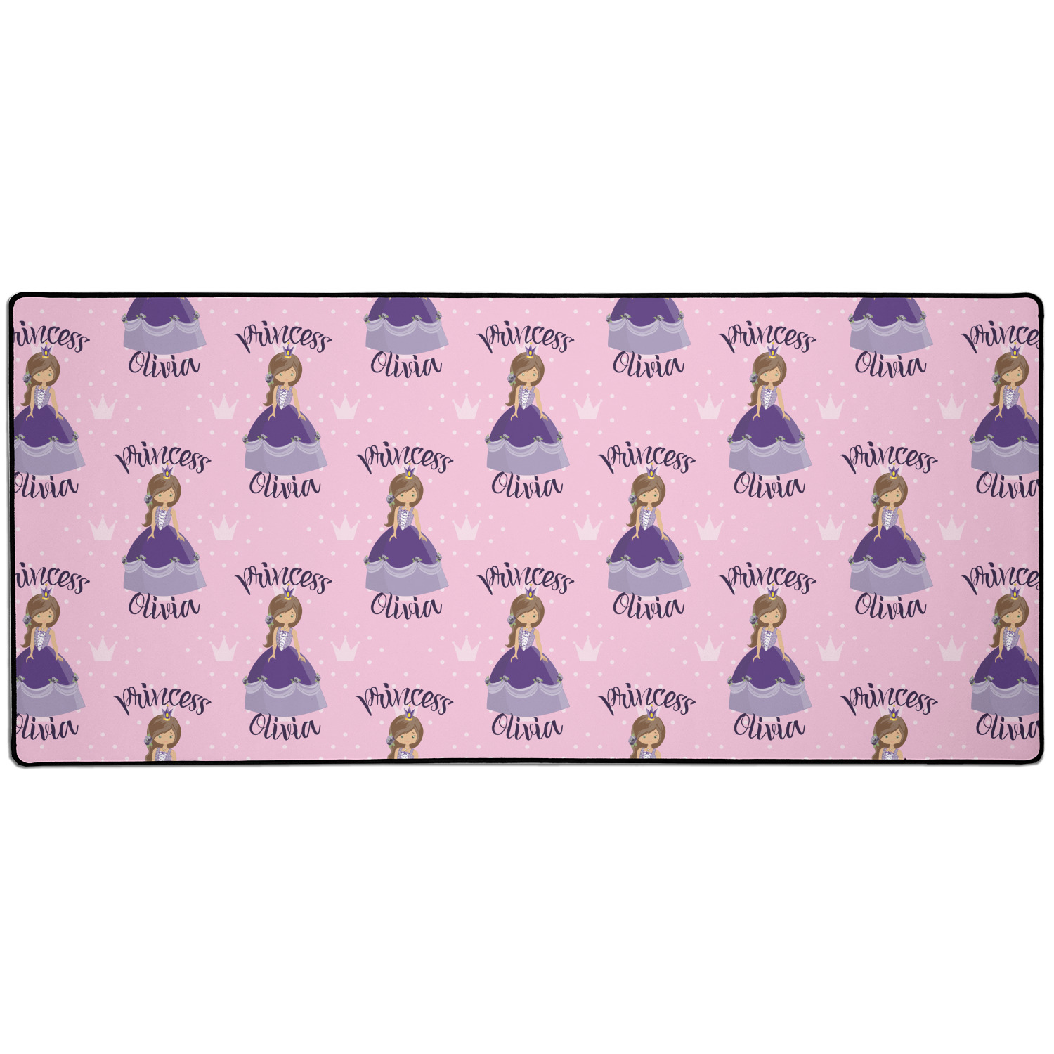 This is truly custom personalized design. You can customize almost all aspects of the design. You can customize the top and bottom text, along with the font and color. The princess' hair color, skin color, eye and even her crown and dress color can be customized. We also have a number of other princesses in our system, so you can always change out the princess. The background pattern and color customizable.
