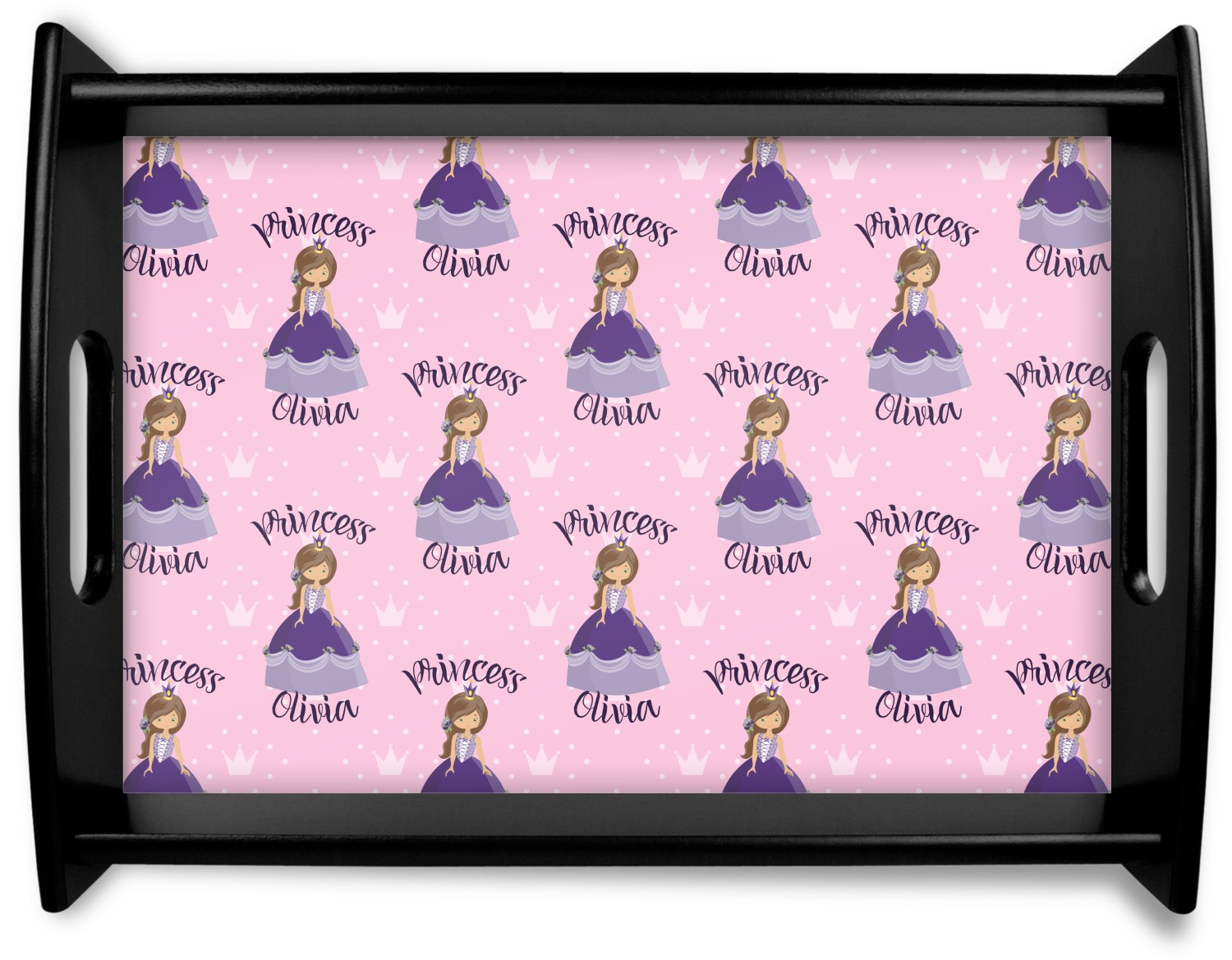 This is truly custom personalized design. You can customize almost all aspects of the design. You can customize the top and bottom text, along with the font and color. The princess' hair color, skin color, eye and even her crown and dress color can be customized. We also have a number of other princesses in our system, so you can always change out the princess. The background pattern and color customizable.