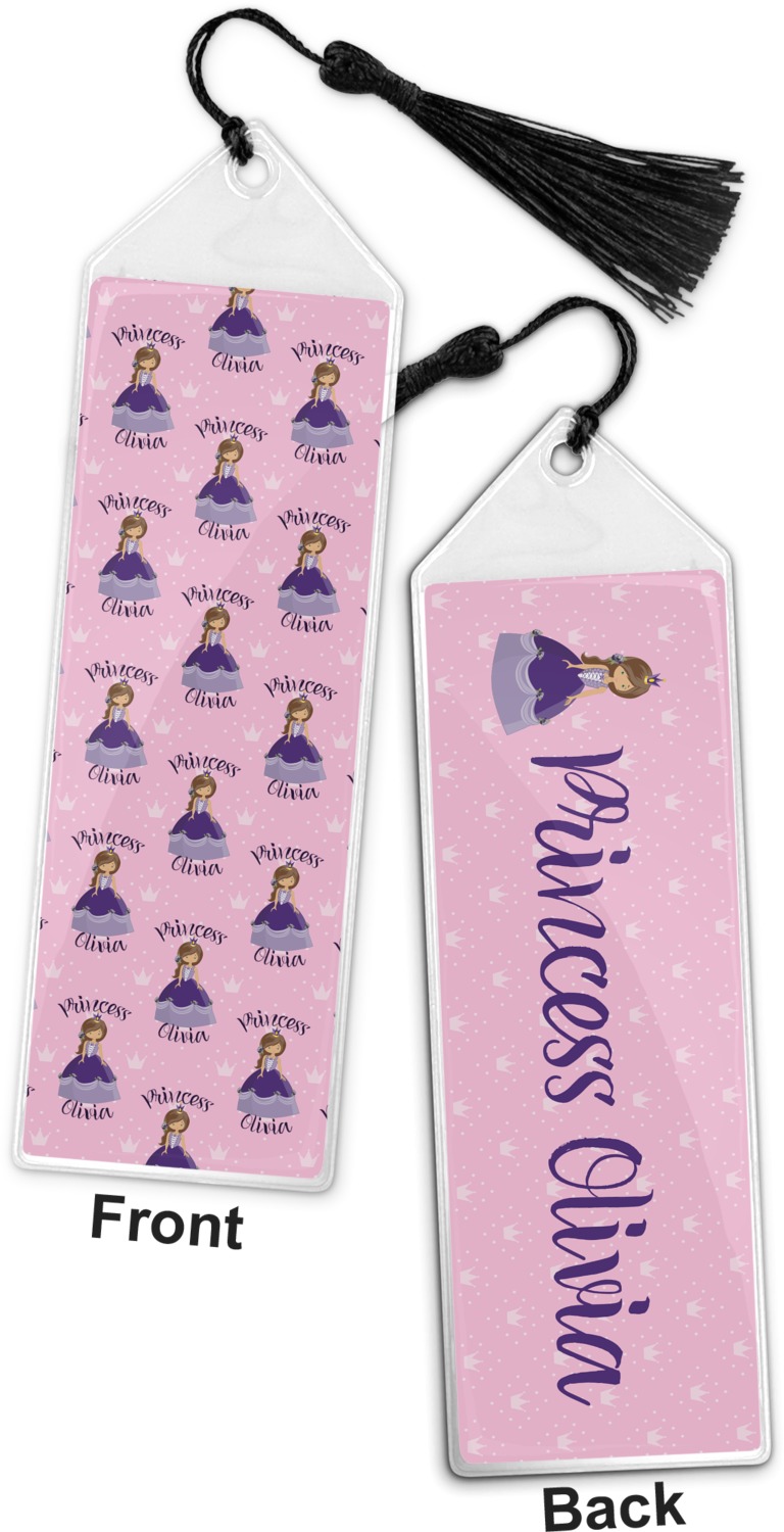 Your personalized bookmark is made of a sturdy, clear vinyl, and is approximately 7.5" x 2.25". We display your personalization on vinyl inserts that are placed on both sides. Accompanying each book marker is a black, fringe tassel that attaches to the reinforced, triangular header.