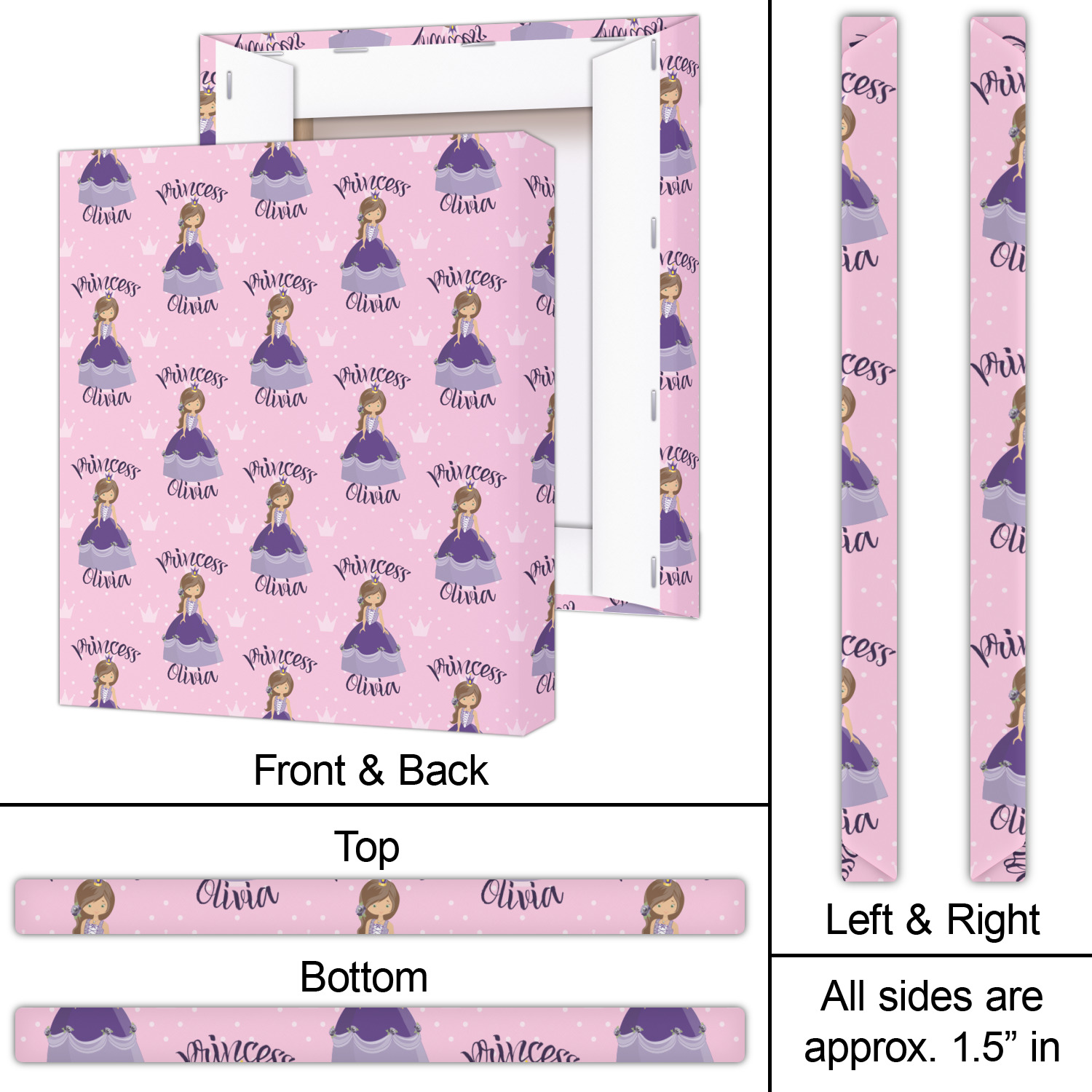 This is truly custom personalized design. You can customize almost all aspects of the design. You can customize the top and bottom text, along with the font and color. The princess' hair color, skin color, eye and even her crown and dress color can be customized. We also have a number of other princesses in our system, so you can always change out the princess. The background pattern and color customizable.