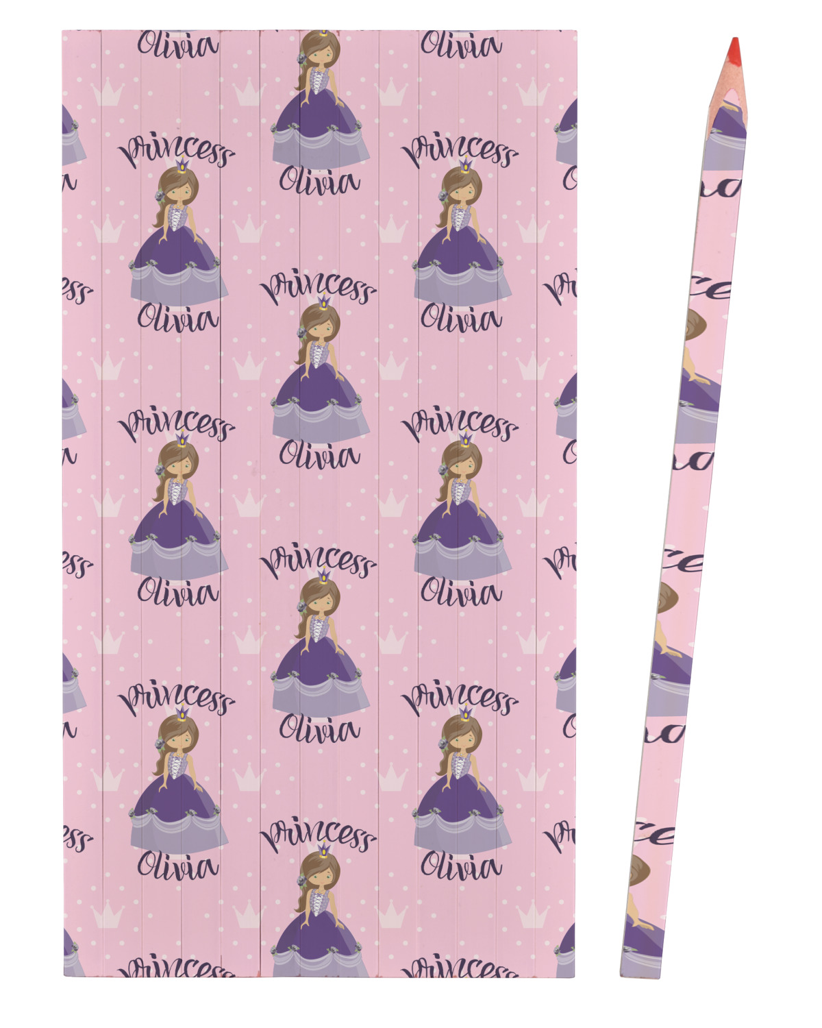 This is truly custom personalized design. You can customize almost all aspects of the design. You can customize the top and bottom text, along with the font and color. The princess' hair color, skin color, eye and even her crown and dress color can be customized. We also have a number of other princesses in our system, so you can always change out the princess. The background pattern and color customizable.
