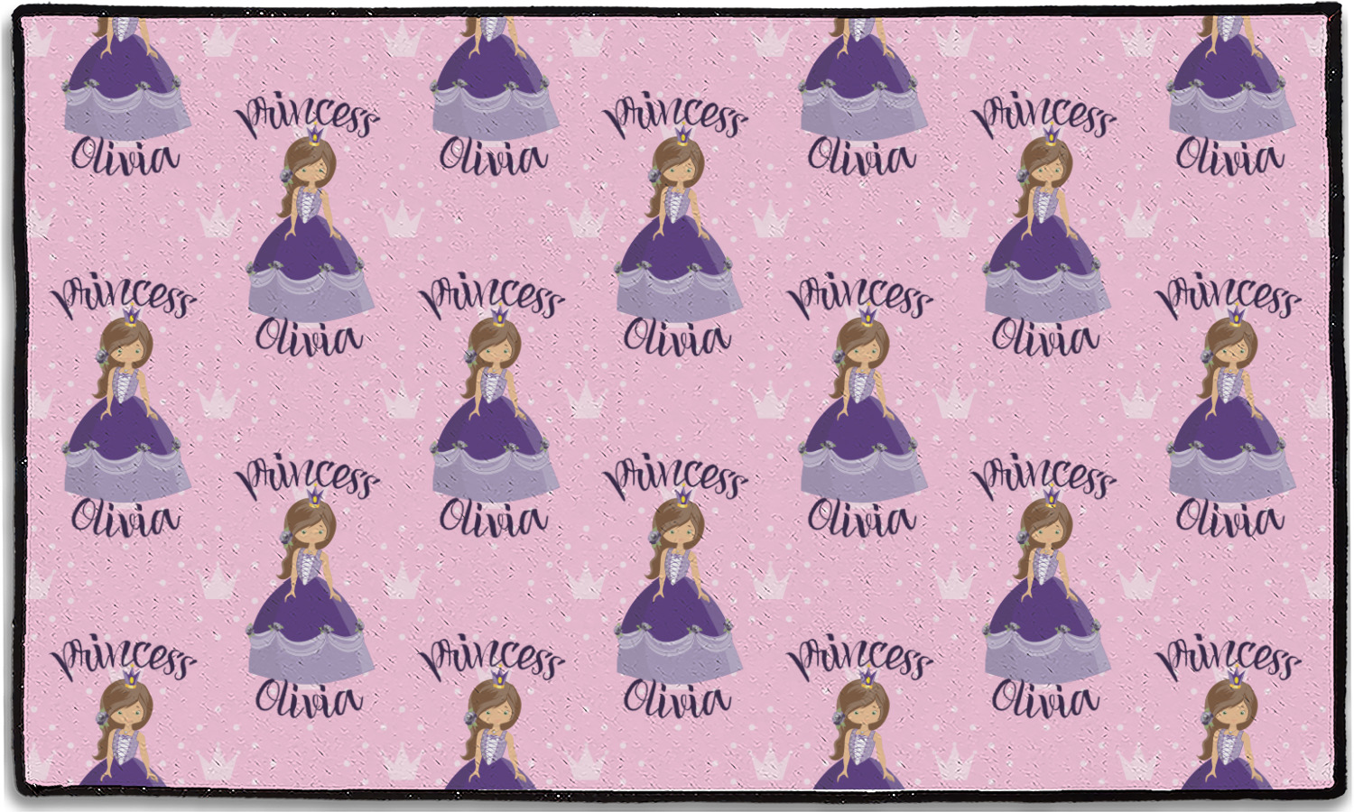 This is truly custom personalized design. You can customize almost all aspects of the design. You can customize the top and bottom text, along with the font and color. The princess' hair color, skin color, eye and even her crown and dress color can be customized. We also have a number of other princesses in our system, so you can always change out the princess. The background pattern and color customizable.