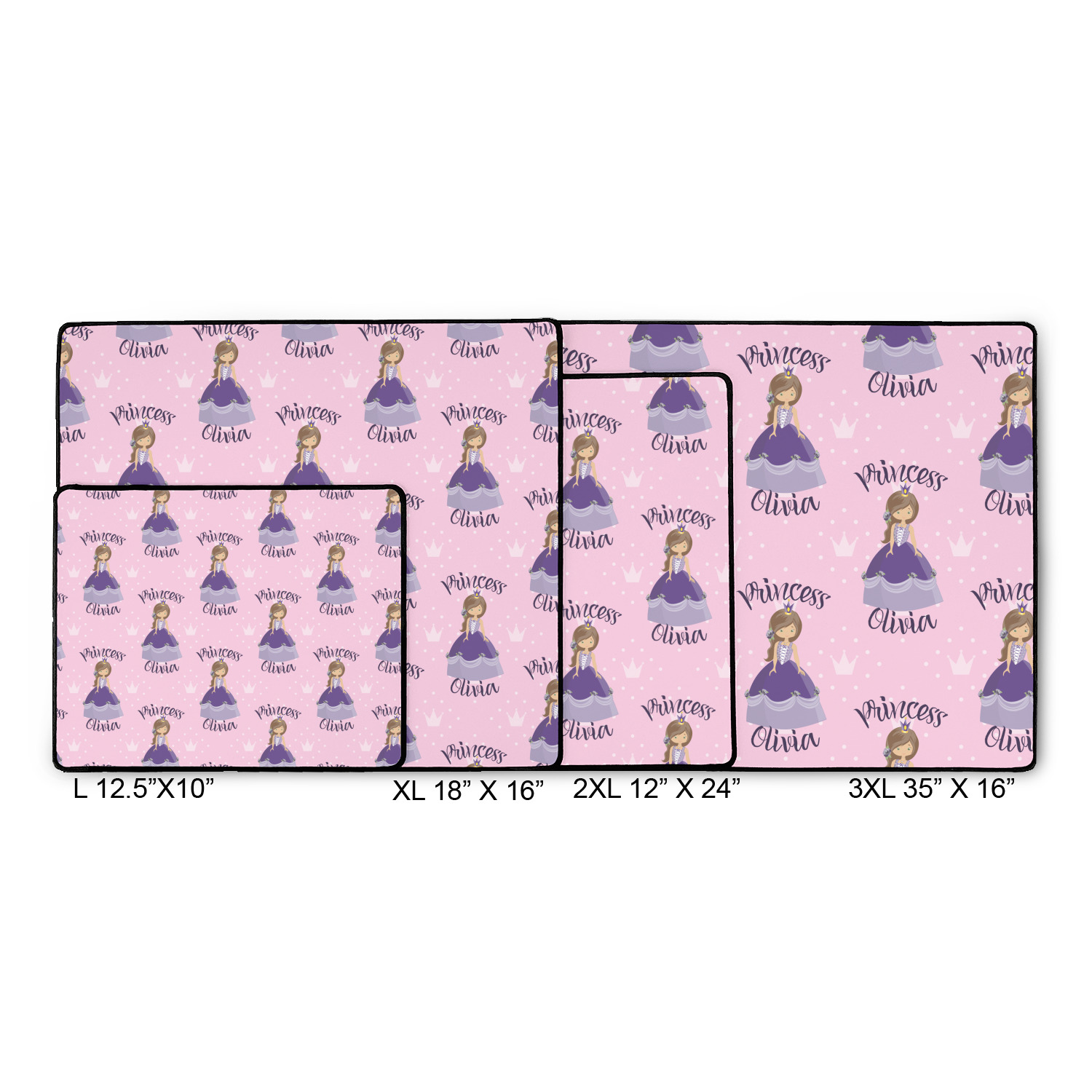 This is truly custom personalized design. You can customize almost all aspects of the design. You can customize the top and bottom text, along with the font and color. The princess' hair color, skin color, eye and even her crown and dress color can be customized. We also have a number of other princesses in our system, so you can always change out the princess. The background pattern and color customizable.