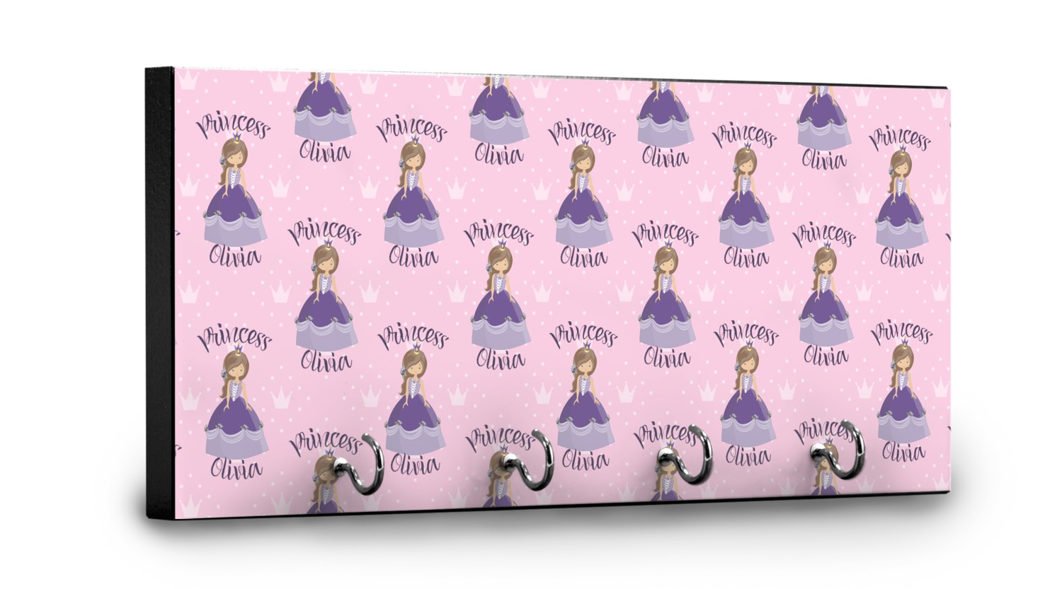 This is truly custom personalized design. You can customize almost all aspects of the design. You can customize the top and bottom text, along with the font and color. The princess' hair color, skin color, eye and even her crown and dress color can be customized. We also have a number of other princesses in our system, so you can always change out the princess. The background pattern and color customizable.