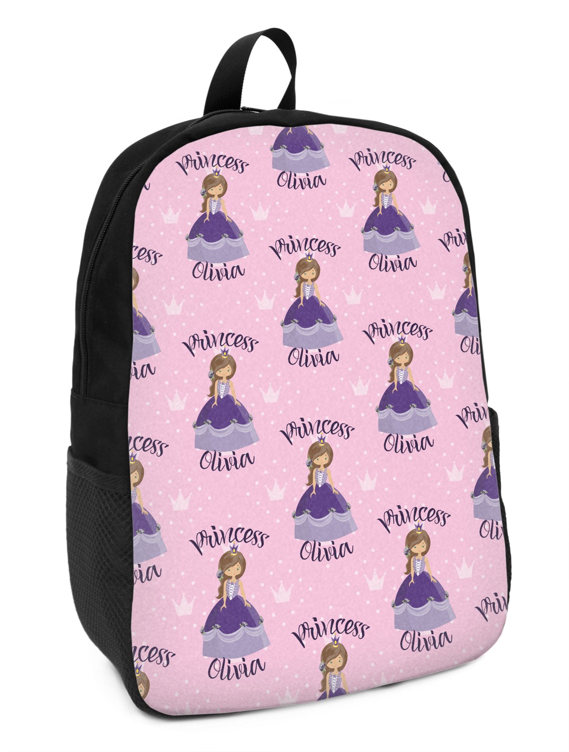 This is truly custom personalized design. You can customize almost all aspects of the design. You can customize the top and bottom text, along with the font and color. The princess' hair color, skin color, eye and even her crown and dress color can be customized. We also have a number of other princesses in our system, so you can always change out the princess. The background pattern and color customizable.