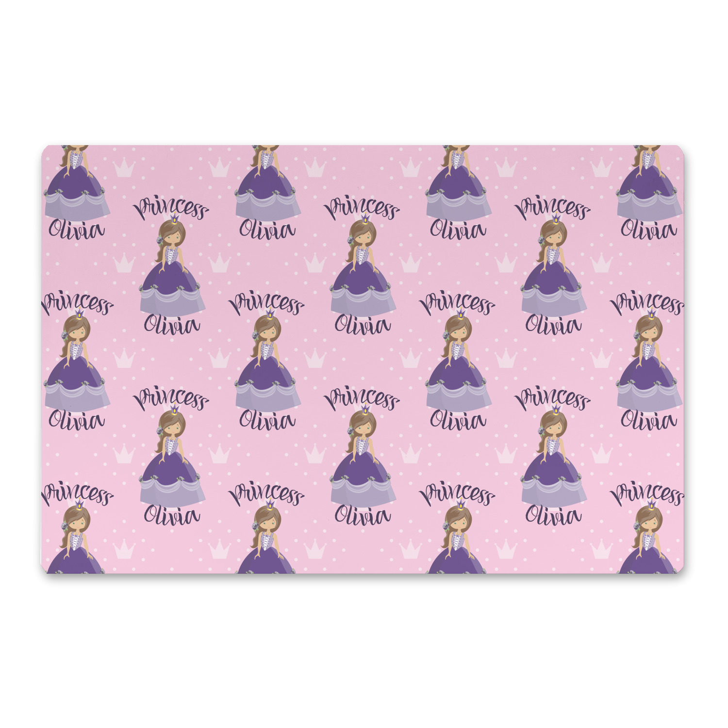 This is truly custom personalized design. You can customize almost all aspects of the design. You can customize the top and bottom text, along with the font and color. The princess' hair color, skin color, eye and even her crown and dress color can be customized. We also have a number of other princesses in our system, so you can always change out the princess. The background pattern and color customizable.