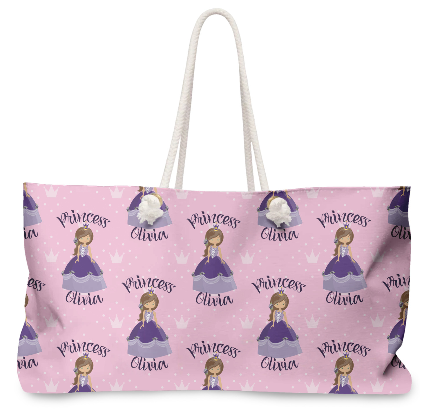 Our oversized weekender tote with rope handles is perfect for your weekend at the beach or on the town. This large tote are 24" W X 13" H, with a 5" gusset and a 27" thick rope handles with a knot that is put through a grommeted brass hole.