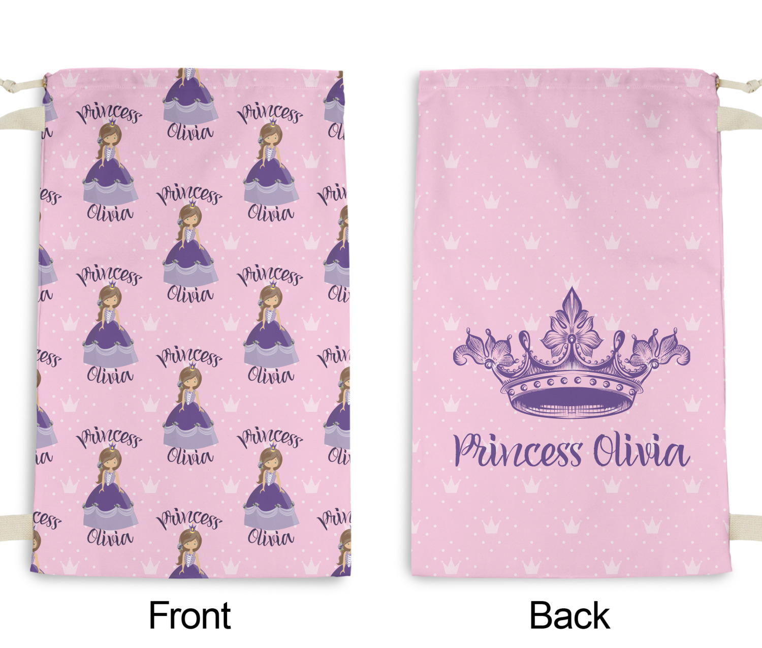 This is truly custom personalized design. You can customize almost all aspects of the design. You can customize the top and bottom text, along with the font and color. The princess' hair color, skin color, eye and even her crown and dress color can be customized. We also have a number of other princesses in our system, so you can always change out the princess. The background pattern and color customizable.