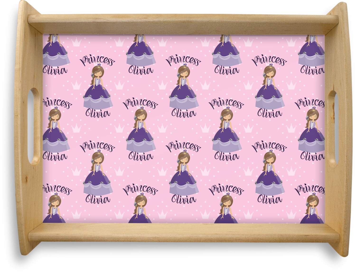 This serving tray with handles features square edges and two rounded sides, creating a very modern look. Each side is fabricated from a beautifully cut, natural wood. The bottom of the interior of the tray displays your customized design in bright, vibrant color. The tray is sold in both a black color and a natural wood look. Each variation of the wood serving tray has two sizes: Small, which is 14" x 10" x 2.25", and Large, which is 19.5" x 13.5" x 2.75".