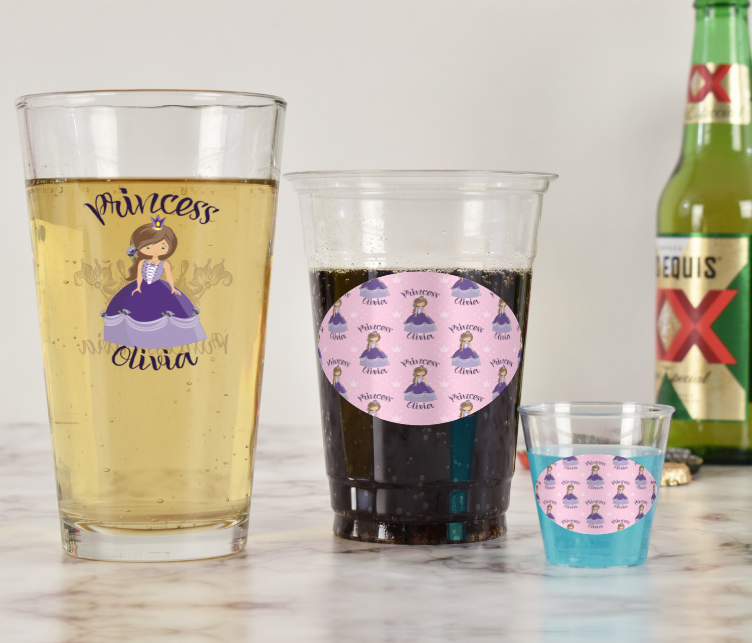 This is truly custom personalized design. You can customize almost all aspects of the design. You can customize the top and bottom text, along with the font and color. The princess' hair color, skin color, eye and even her crown and dress color can be customized. We also have a number of other princesses in our system, so you can always change out the princess. The background pattern and color customizable.