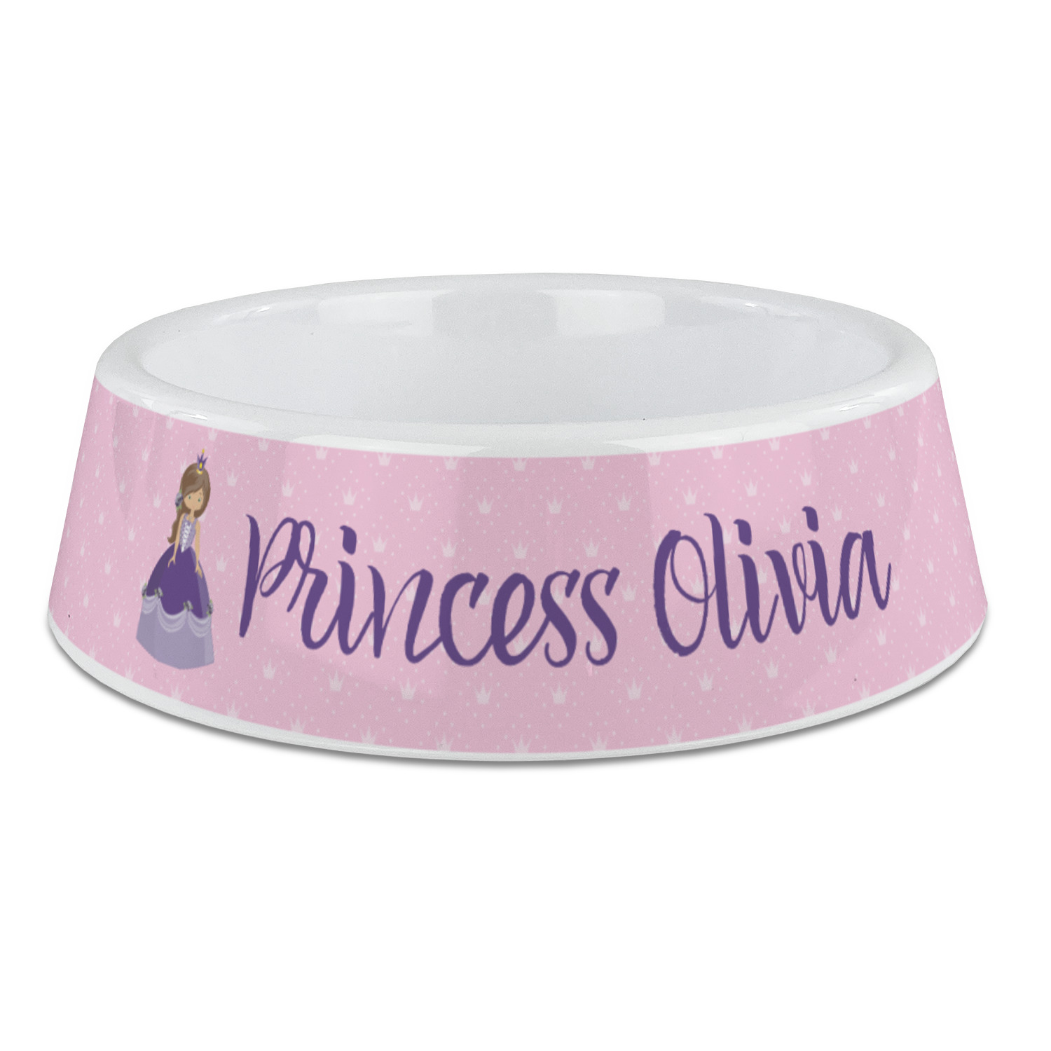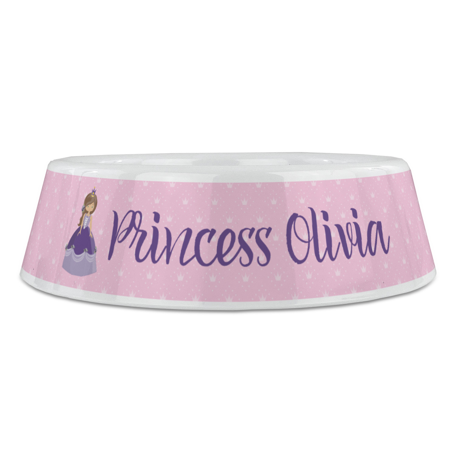 This is truly custom personalized design. You can customize almost all aspects of the design. You can customize the top and bottom text, along with the font and color. The princess' hair color, skin color, eye and even her crown and dress color can be customized. We also have a number of other princesses in our system, so you can always change out the princess. The background pattern and color customizable.