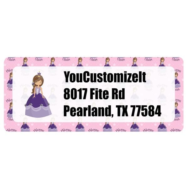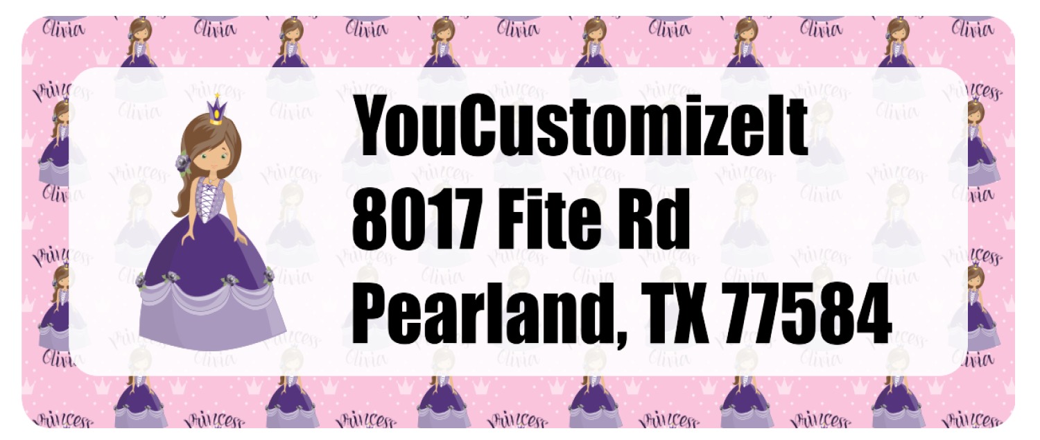 This is truly custom personalized design. You can customize almost all aspects of the design. You can customize the top and bottom text, along with the font and color. The princess' hair color, skin color, eye and even her crown and dress color can be customized. We also have a number of other princesses in our system, so you can always change out the princess. The background pattern and color customizable.