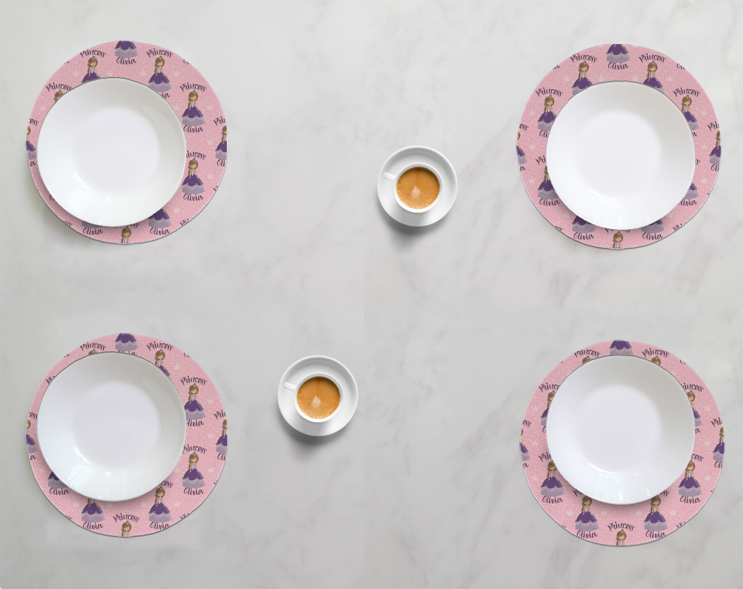 This is truly custom personalized design. You can customize almost all aspects of the design. You can customize the top and bottom text, along with the font and color. The princess' hair color, skin color, eye and even her crown and dress color can be customized. We also have a number of other princesses in our system, so you can always change out the princess. The background pattern and color customizable.