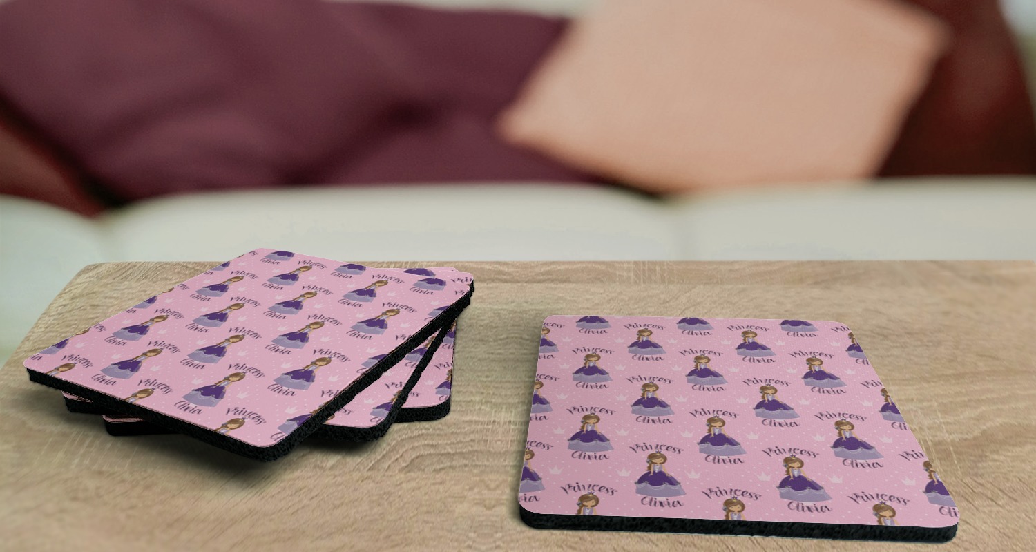 These drink coasters have a smooth, polyester top and a textured, rubber backing on its bottom. The non-slip rubber backing underneath works to keep any spills at bay. At 4 by 4 by 0.25 inches thick, these custom coasters are a suitable size for most drinkware. Your personalization is displayed atop the face of the cup coaster. We sell these rubber coasters in two different shapes: square and round. You can buy each shape as singulars or as a set of 4.