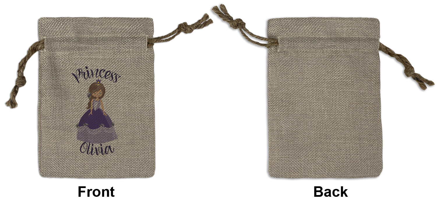 We sell our Burlap Gift Bags in 3 variant sized bags. Made with burlap polyester, each personalized bag can be secured with a twine drawstring pull. Your custom design is available to print on one side or both sides - completely up to you! The sizes of the bags measure approximately 4.5" x 6.5" for the smallest size, 6.5" x 8.0" for the medium size, and 6.5" x 13.5" for the large-sized bag.