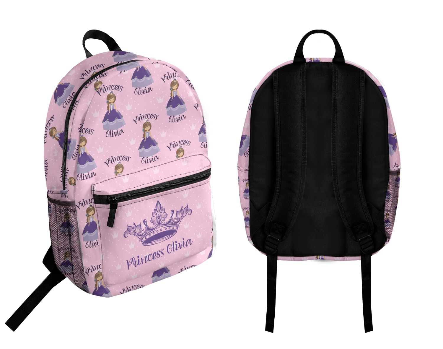 This is truly custom personalized design. You can customize almost all aspects of the design. You can customize the top and bottom text, along with the font and color. The princess' hair color, skin color, eye and even her crown and dress color can be customized. We also have a number of other princesses in our system, so you can always change out the princess. The background pattern and color customizable.