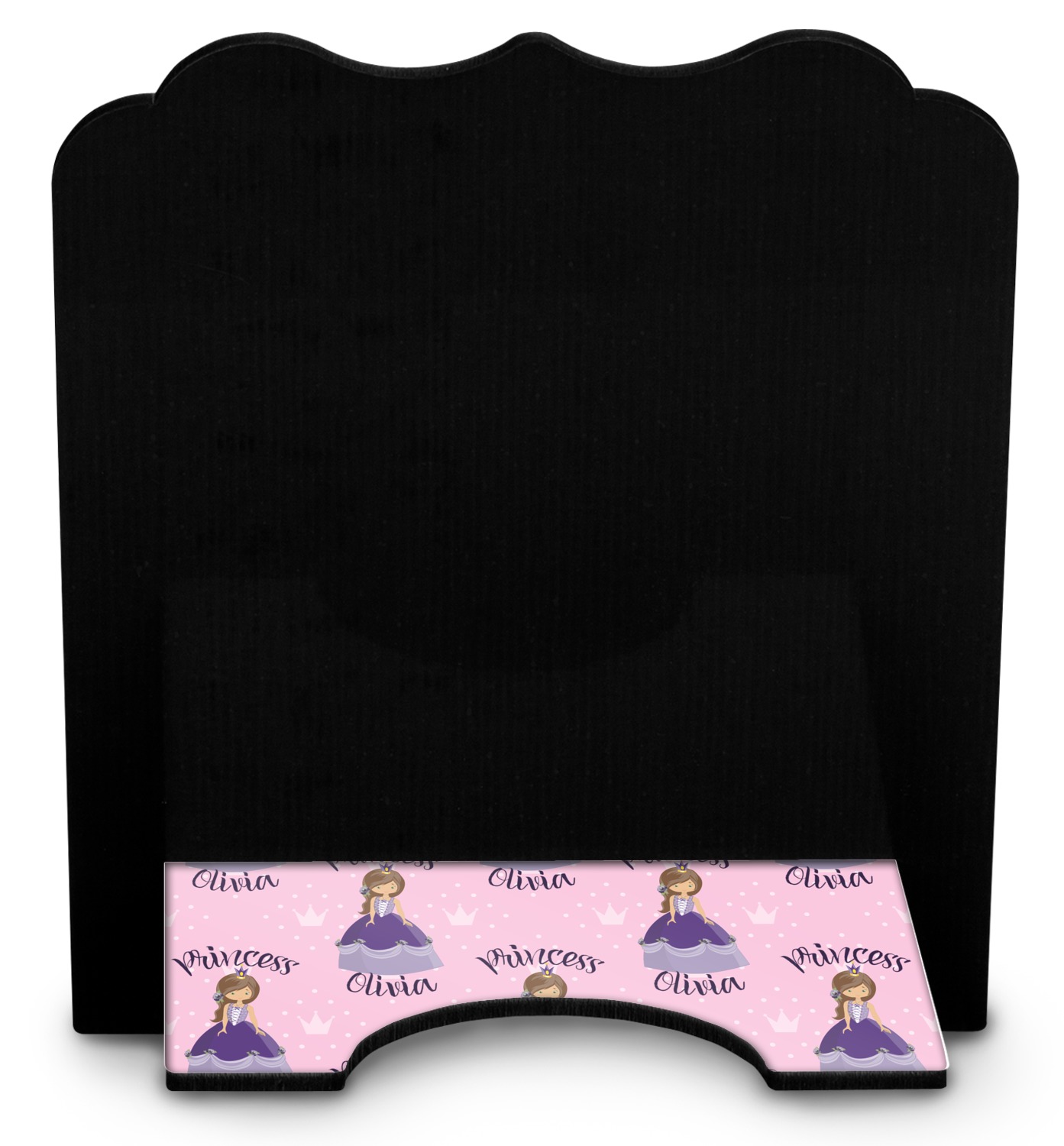 This is truly custom personalized design. You can customize almost all aspects of the design. You can customize the top and bottom text, along with the font and color. The princess' hair color, skin color, eye and even her crown and dress color can be customized. We also have a number of other princesses in our system, so you can always change out the princess. The background pattern and color customizable.