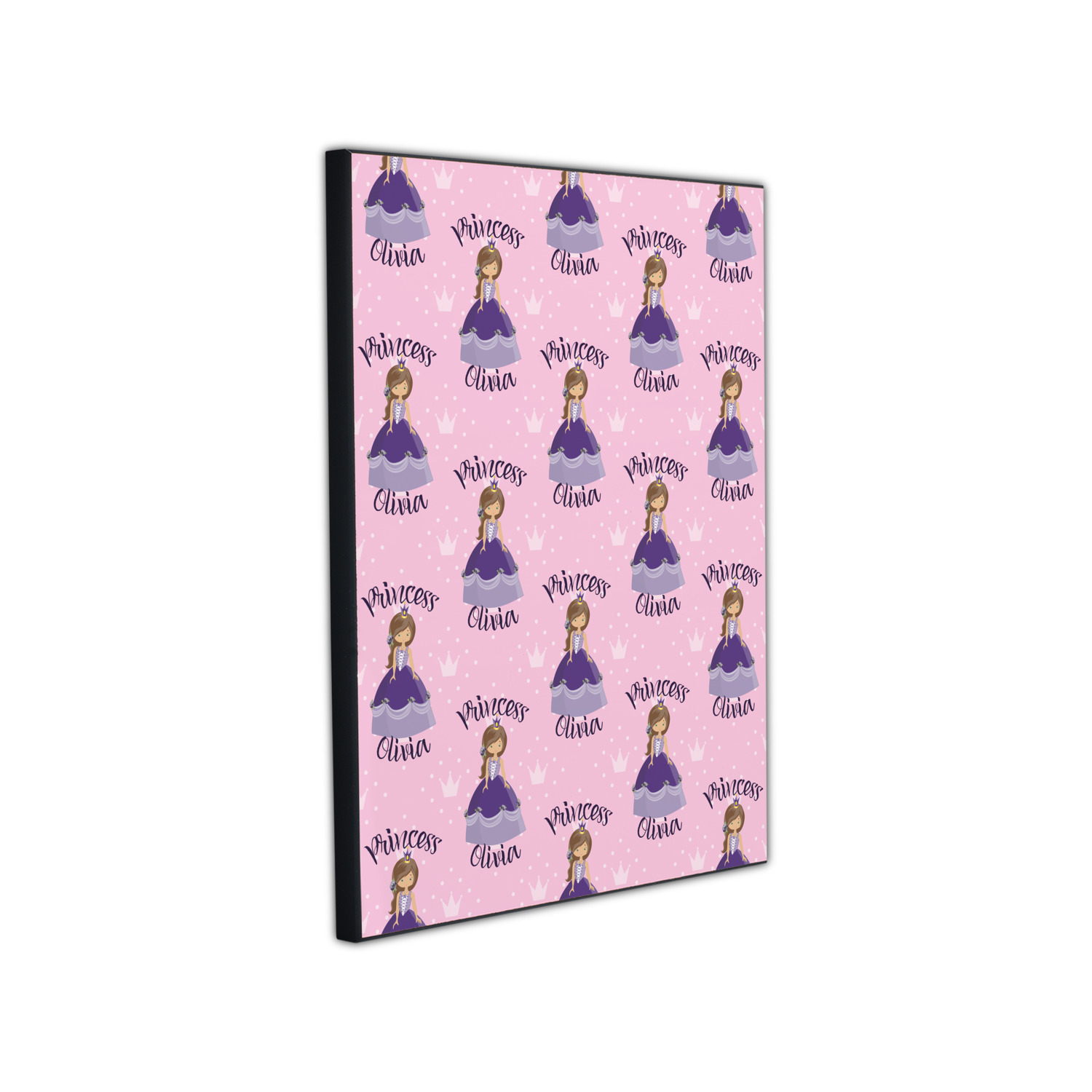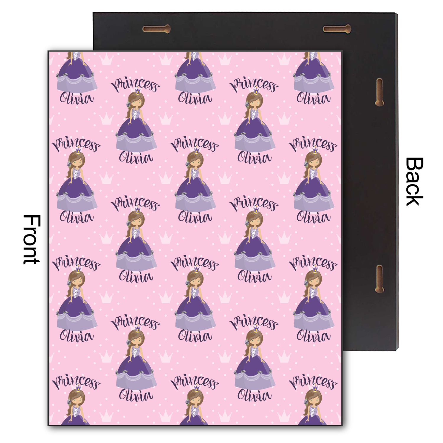 This is truly custom personalized design. You can customize almost all aspects of the design. You can customize the top and bottom text, along with the font and color. The princess' hair color, skin color, eye and even her crown and dress color can be customized. We also have a number of other princesses in our system, so you can always change out the princess. The background pattern and color customizable.