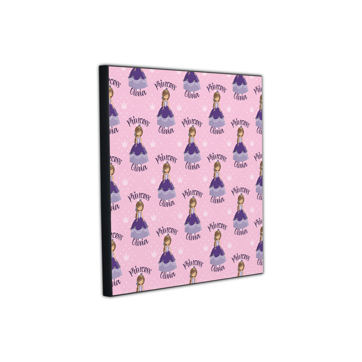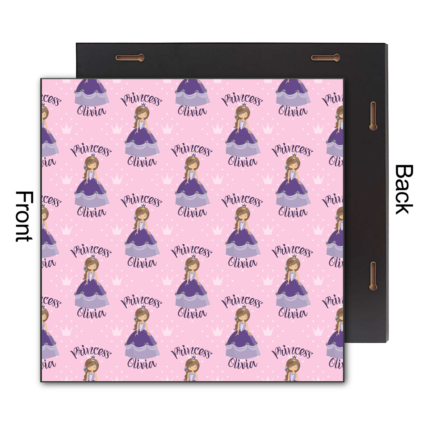 This is truly custom personalized design. You can customize almost all aspects of the design. You can customize the top and bottom text, along with the font and color. The princess' hair color, skin color, eye and even her crown and dress color can be customized. We also have a number of other princesses in our system, so you can always change out the princess. The background pattern and color customizable.