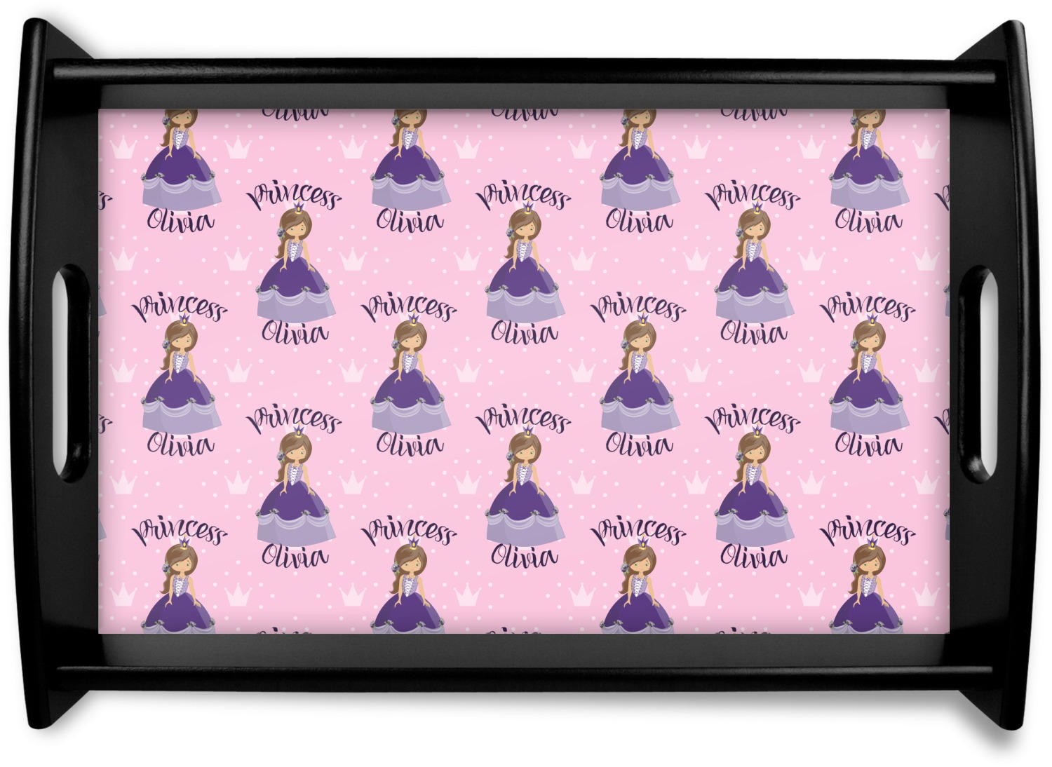 This is truly custom personalized design. You can customize almost all aspects of the design. You can customize the top and bottom text, along with the font and color. The princess' hair color, skin color, eye and even her crown and dress color can be customized. We also have a number of other princesses in our system, so you can always change out the princess. The background pattern and color customizable.