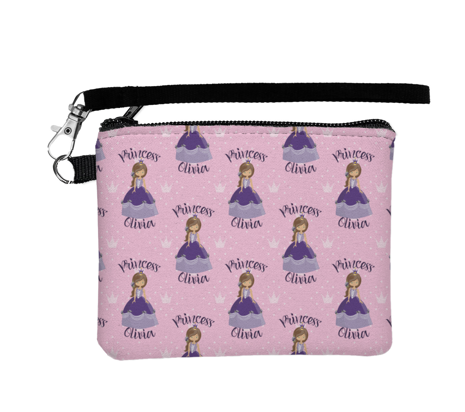 This is truly custom personalized design. You can customize almost all aspects of the design. You can customize the top and bottom text, along with the font and color. The princess' hair color, skin color, eye and even her crown and dress color can be customized. We also have a number of other princesses in our system, so you can always change out the princess. The background pattern and color customizable.
