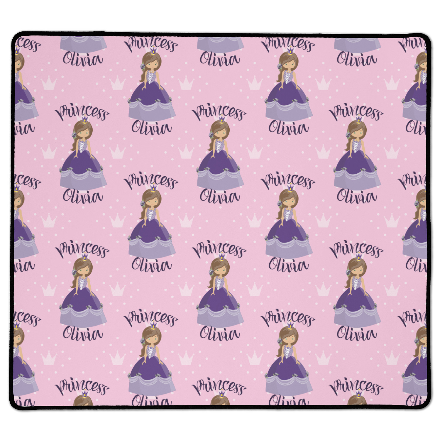 This is truly custom personalized design. You can customize almost all aspects of the design. You can customize the top and bottom text, along with the font and color. The princess' hair color, skin color, eye and even her crown and dress color can be customized. We also have a number of other princesses in our system, so you can always change out the princess. The background pattern and color customizable.