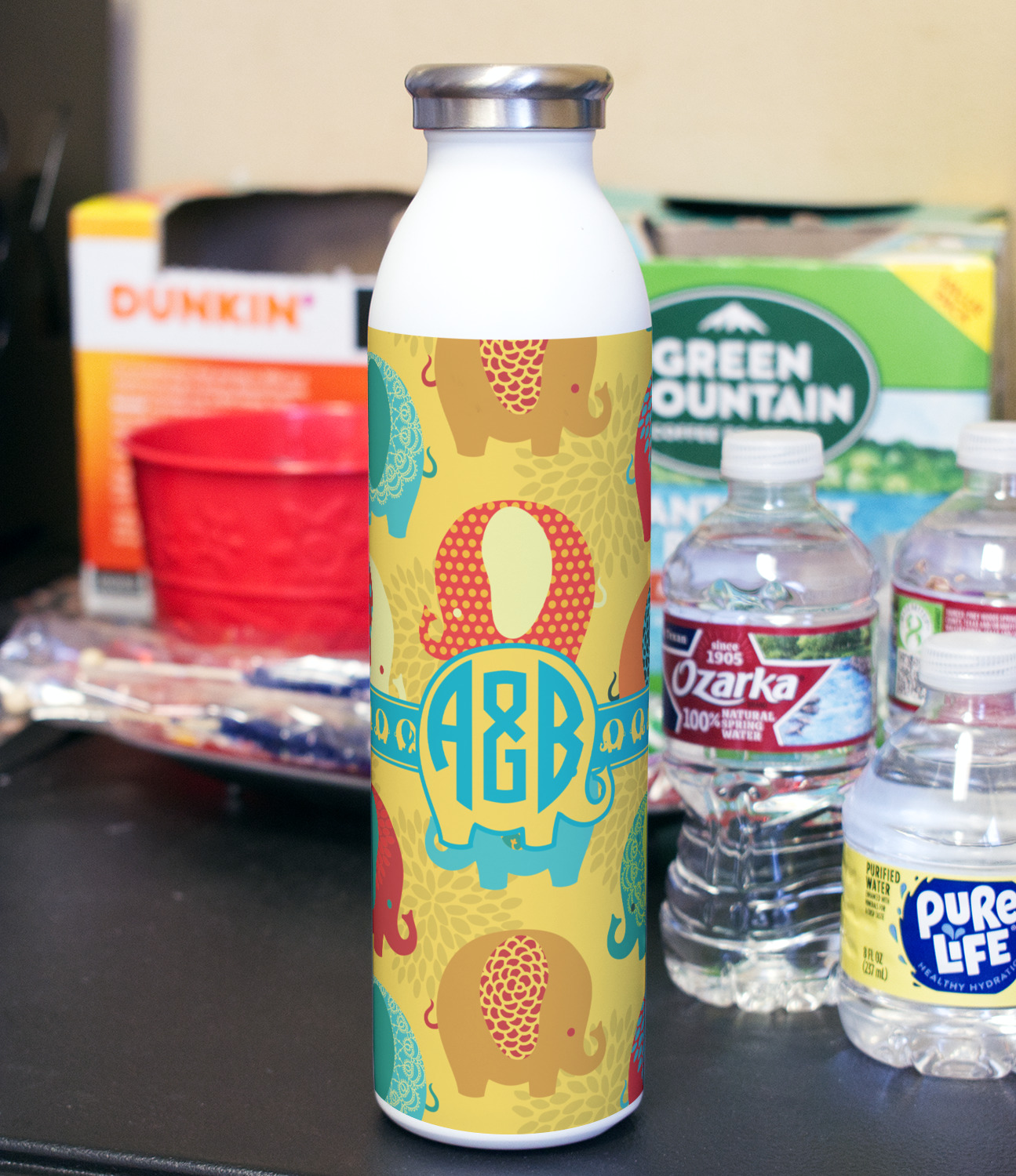 We created a ribbon & label just for this design with the adorable elephants and used them both and coordinated with teal. For the personalization, we chose the round monogram as we thought it looked adorable with the cute elephant label.
