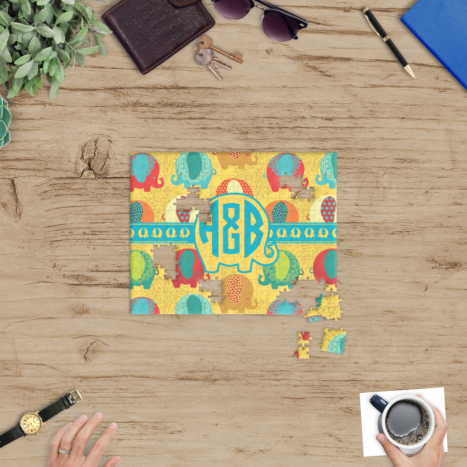 You can also upload your logo or art that you or your kids drew. To create more challenging jigsaw puzzles, you can create a pattern from with your logo or artwork. You can also add other elements such as text or personalization.