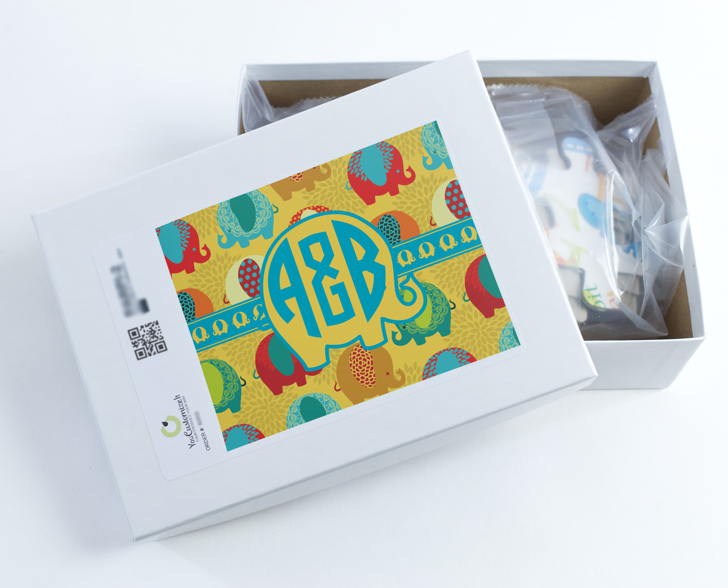 We created a ribbon & label just for this design with the adorable elephants and used them both and coordinated with teal. For the personalization, we chose the round monogram as we thought it looked adorable with the cute elephant label.