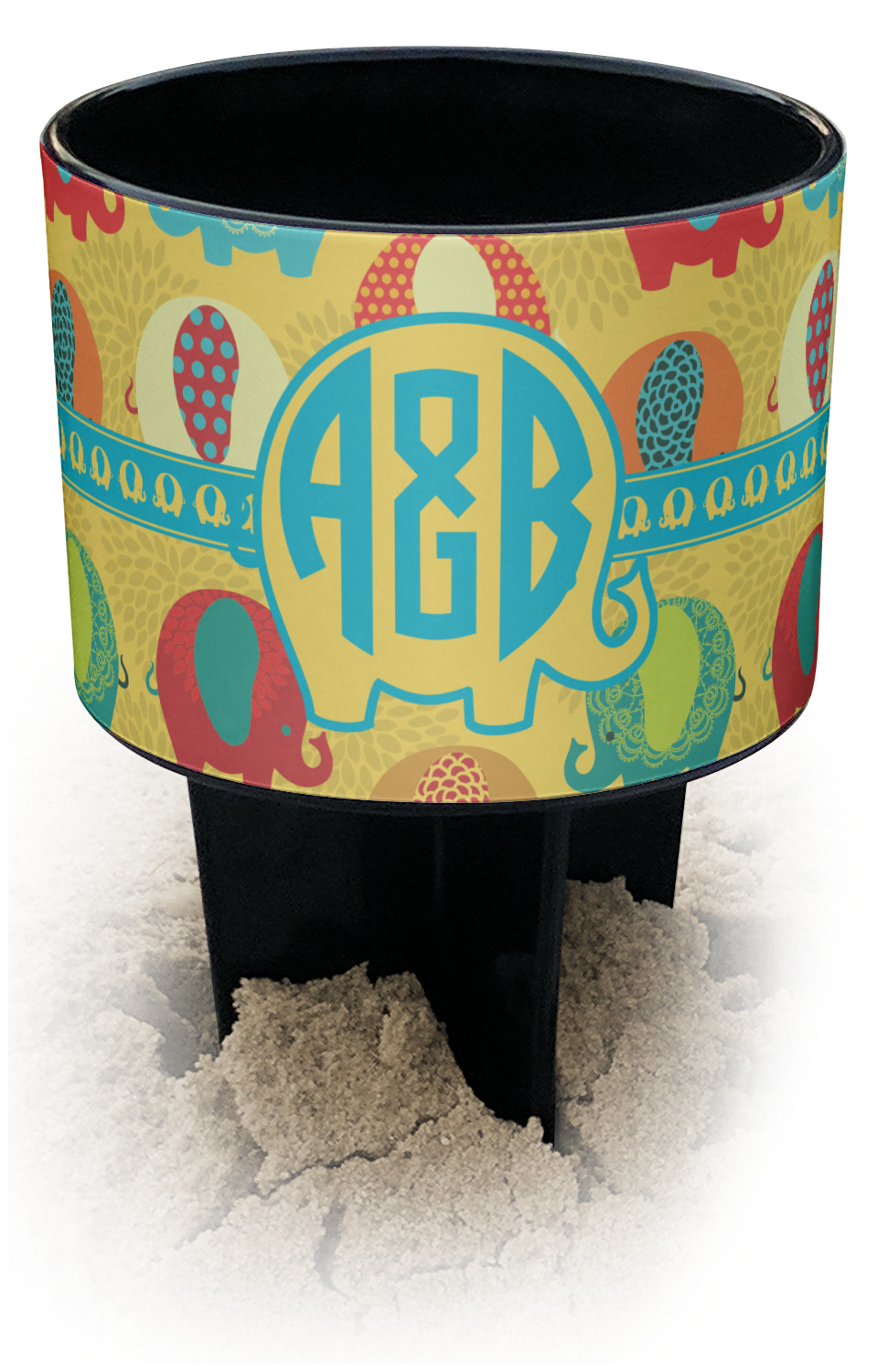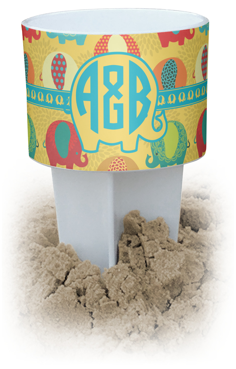 This cup holder has a large stake at its bottom that anchors it to the sand or ground below, while the cup holder rests above the stake. The entire drink holder is made of durable plastic and displays your customization around the cup holder portion. We sell these personalized beach spikers in two different colors: black and white.