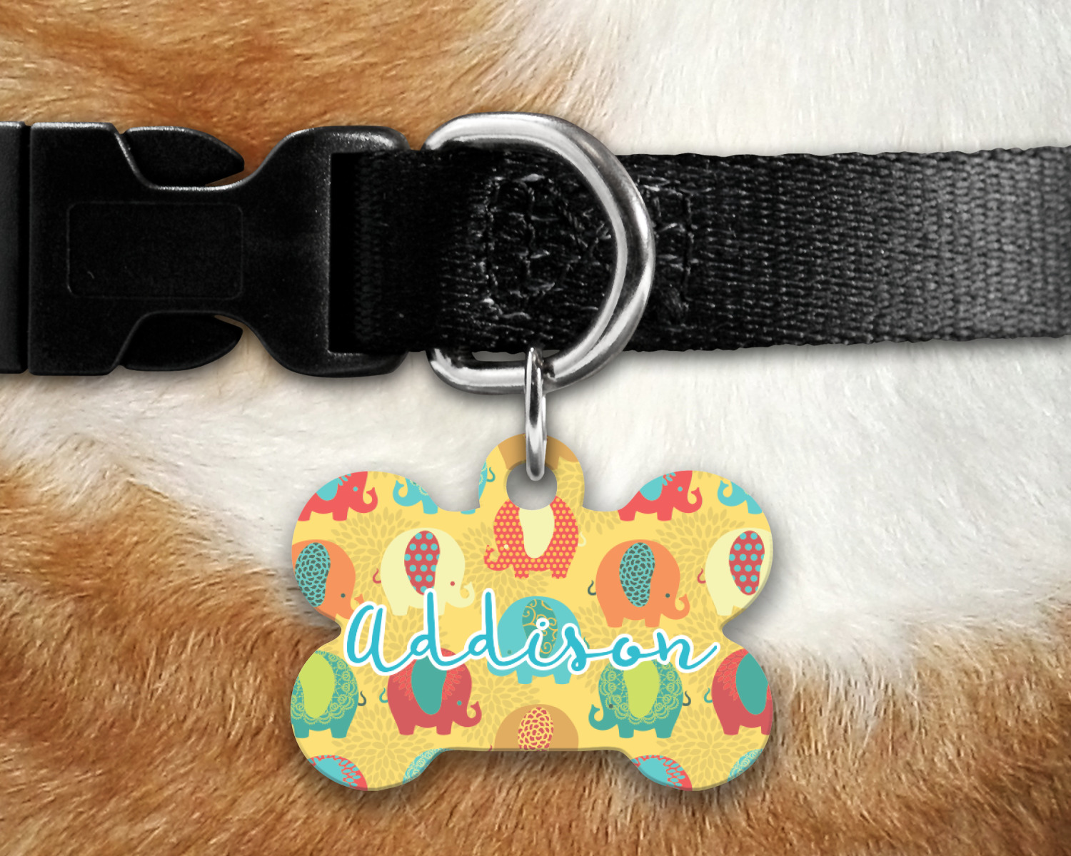 Our default design templates print your dog's personalization on the front and your contact information on the back; however everything is customizable, so you customize the patterns, the colors, the personalization, the contact information etc.