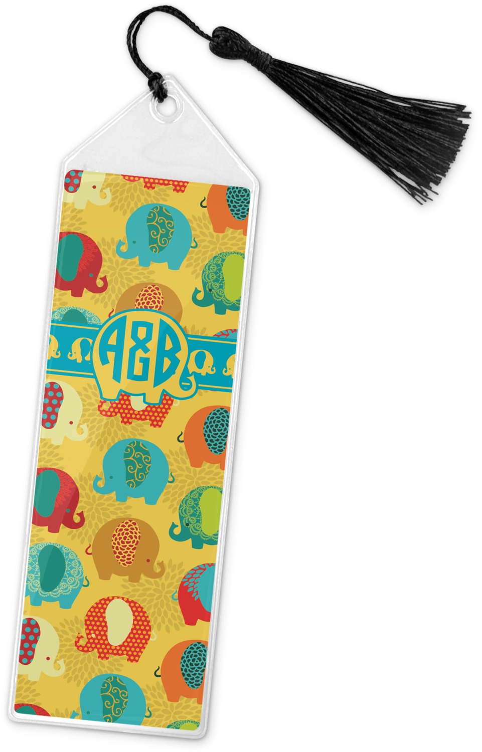 Your personalized bookmark is made of a sturdy, clear vinyl, and is approximately 7.5" x 2.25". We display your personalization on vinyl inserts that are placed on both sides. Accompanying each book marker is a black, fringe tassel that attaches to the reinforced, triangular header.