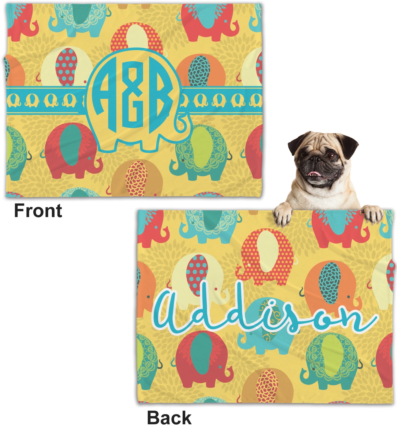 These dog blankets are crafted from a gentle, soft-to-the-touch, minky material. We print your customizations, either matching or differing, on both the top and underside of the blanket. These personalized dog blankets are available in two sizes: regular and large. Our regular size, at 40" x 30", accommodates small and some medium size dogs. At 60" x 50", our large dog blanket is a better fit for bigger breeds. Though specialized for dogs, these blankets still make a thoughtful gift for your favorite feline, or any other pet in mind!