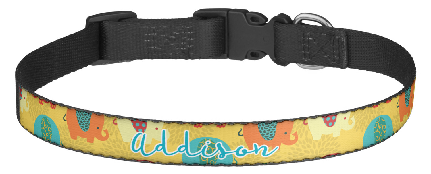 This sturdy collar, made from a durable nylon weave, will outlive your dog's episodes of excited tugging and pulling. Courtesy of its thick plastic buckle and adjuster, this collar is adjustable and accommodating of any dog. Structurally, the collar is a single piece of nylon weave that is sewn together, and features a solid metal loop where you can attach a leash or dog tag. We print and display your dog's name and pattern across the middle of the personalized dog collar.