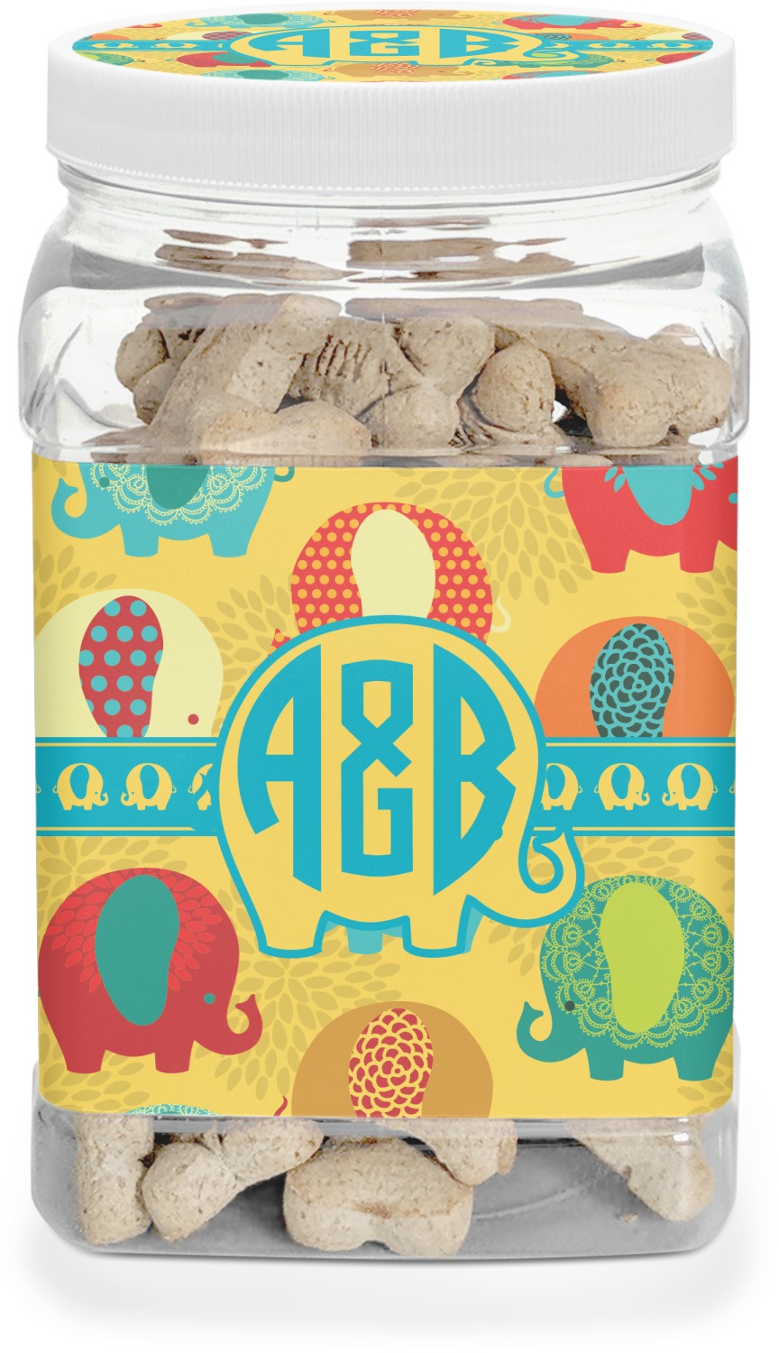 This half gallon jar, made from a sturdy plastic, is the perfect way to keep treats from any naughty pet paws, while still keeping them ready on hand for when your pup performs an impressive trick. This dog cookie jar features a screw-on, white lid that displays your personalized design on a vinyl sticker. We apply another customized sticker that wraps around the front and sides of the jar. Our dog treat jar also has indentations on the rear ends of the sides, which allows for convenient handling, and its square frame allows for easy storage.