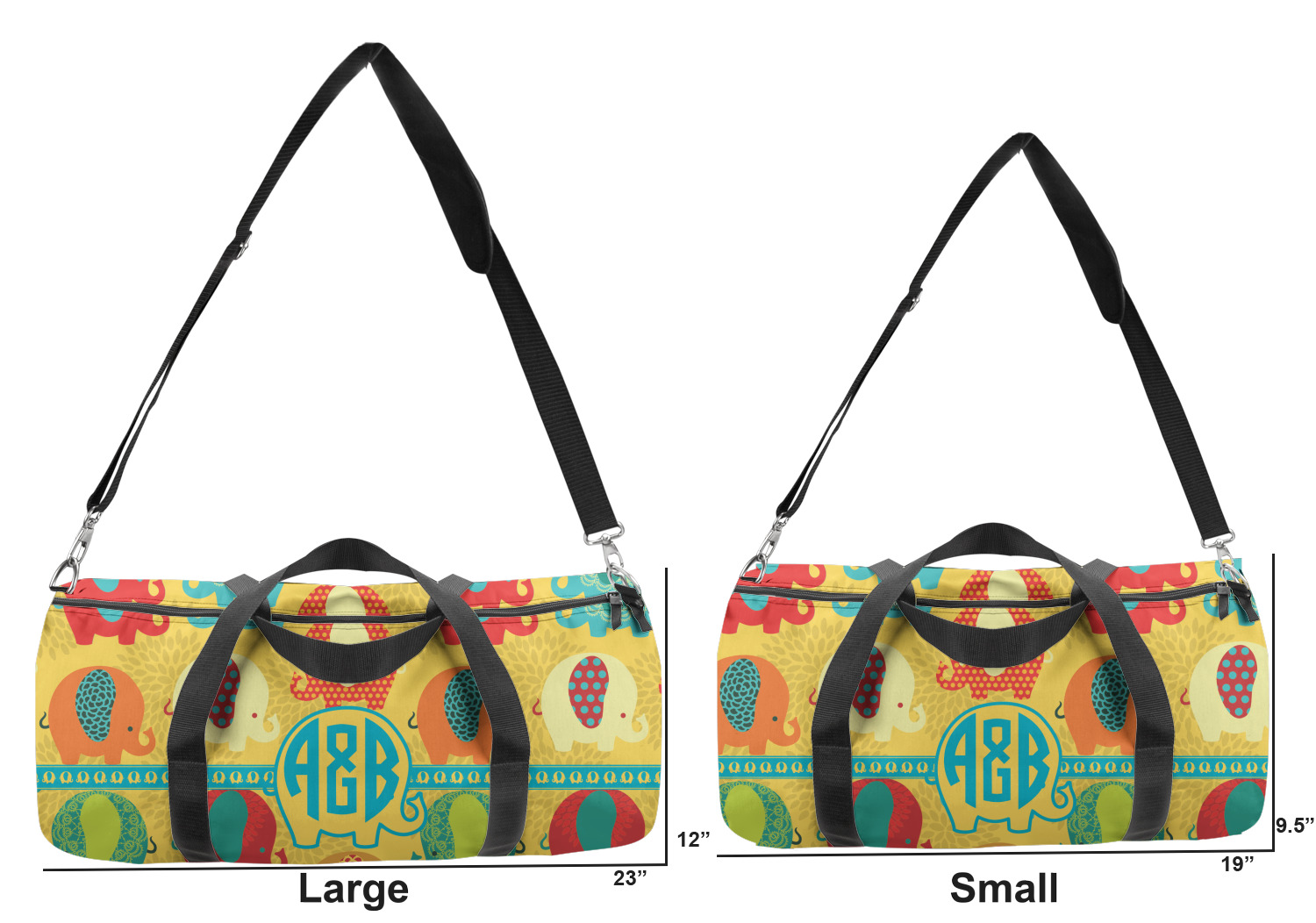 This duffle is a sturdy bag made of a canvas material. It comes in two sizes: Small (19"W x 9.5"H x 9.5"D) and Large (23"W x 12"H x 12"D). The bag is a cylindrical shape with a black adjustable strap and two handles. On one side is an elastic pouch to put a waterbottle or other small item. Your product will be sublimated with your design and is able to be designed on the front, back, and sides. Be sure to remember that the straps may cut into parts of your design if you upload your own artwork.