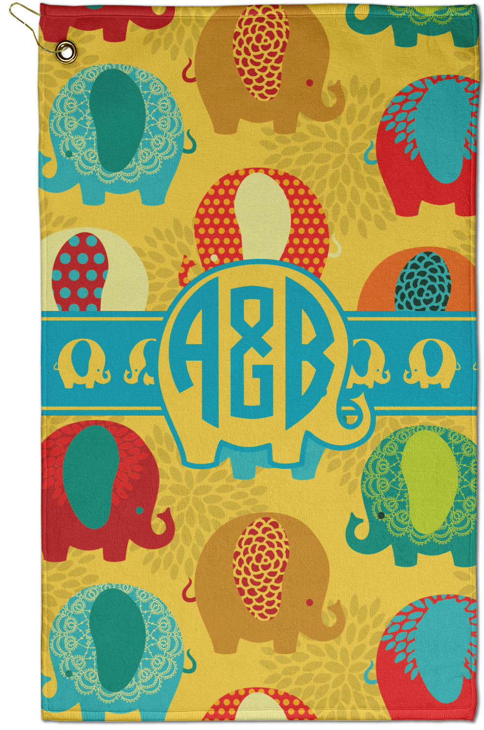 The towel is fully printed / patterned on the front polyester side; and is white on terrycloth cotton backside. The towel has grommet and a pear spring clip in the top left corner. Our golf towels are available in 100s of different prints and patterns.