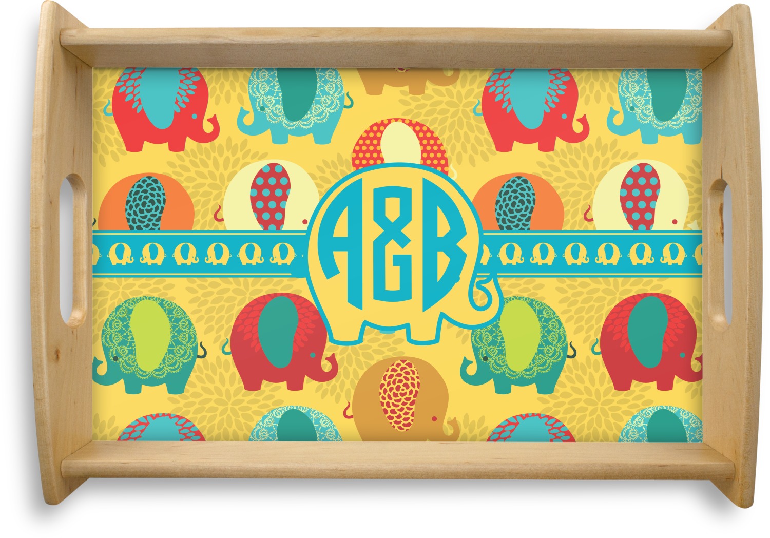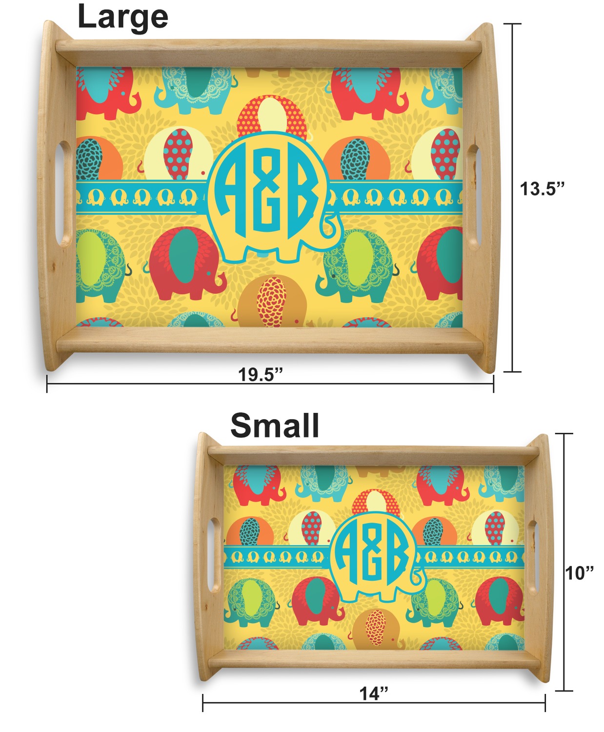 This serving tray with handles features square edges and two rounded sides, creating a very modern look. Each side is fabricated from a beautifully cut, natural wood. The bottom of the interior of the tray displays your customized design in bright, vibrant color. The tray is sold in both a black color and a natural wood look. Each variation of the wood serving tray has two sizes: Small, which is 14" x 10" x 2.25", and Large, which is 19.5" x 13.5" x 2.75".