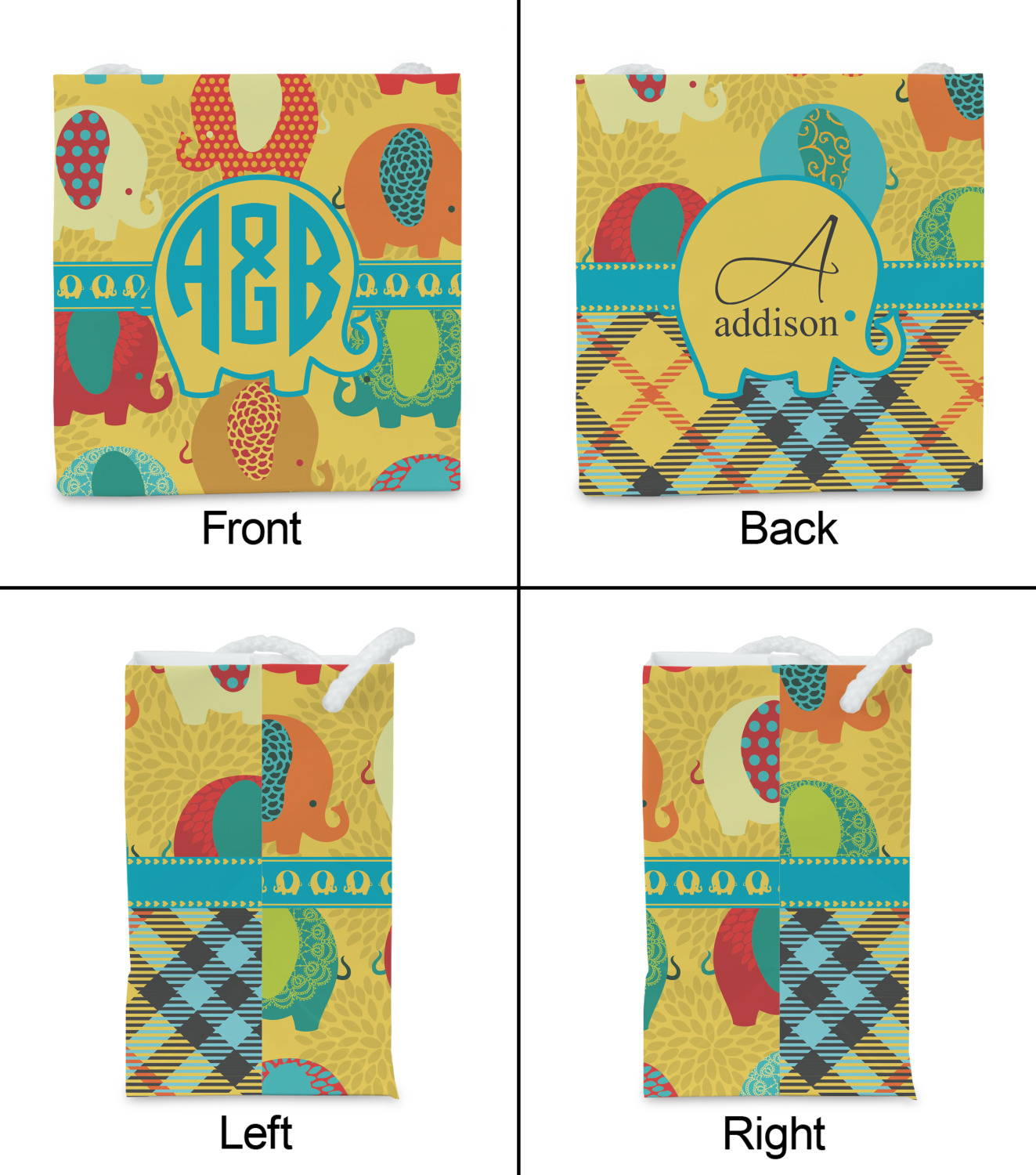 We created a ribbon & label just for this design with the adorable elephants and used them both and coordinated with teal. For the personalization, we chose the round monogram as we thought it looked adorable with the cute elephant label.