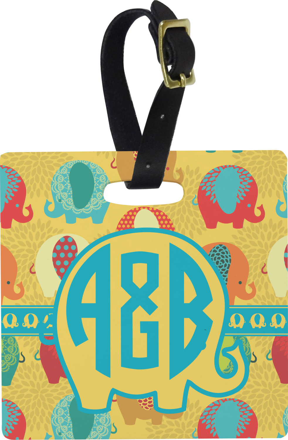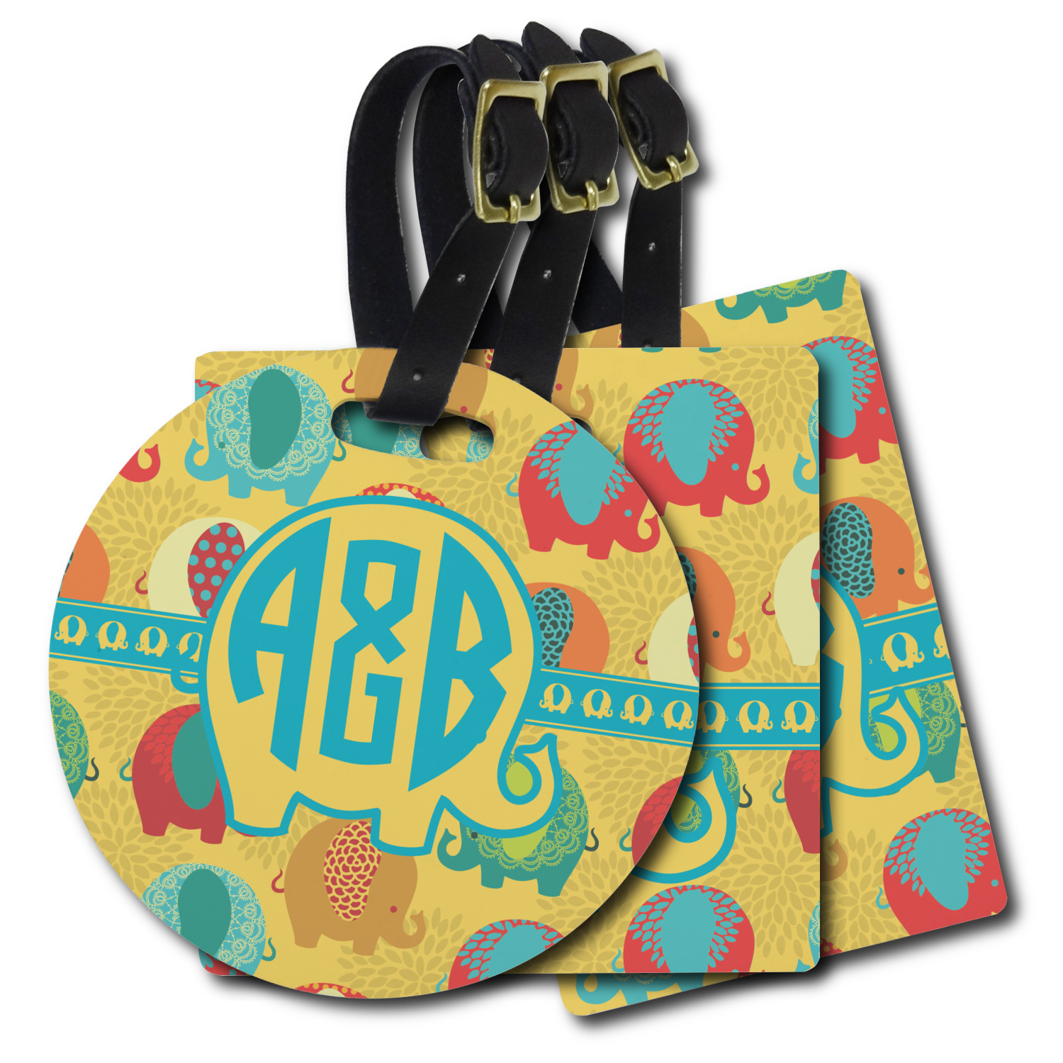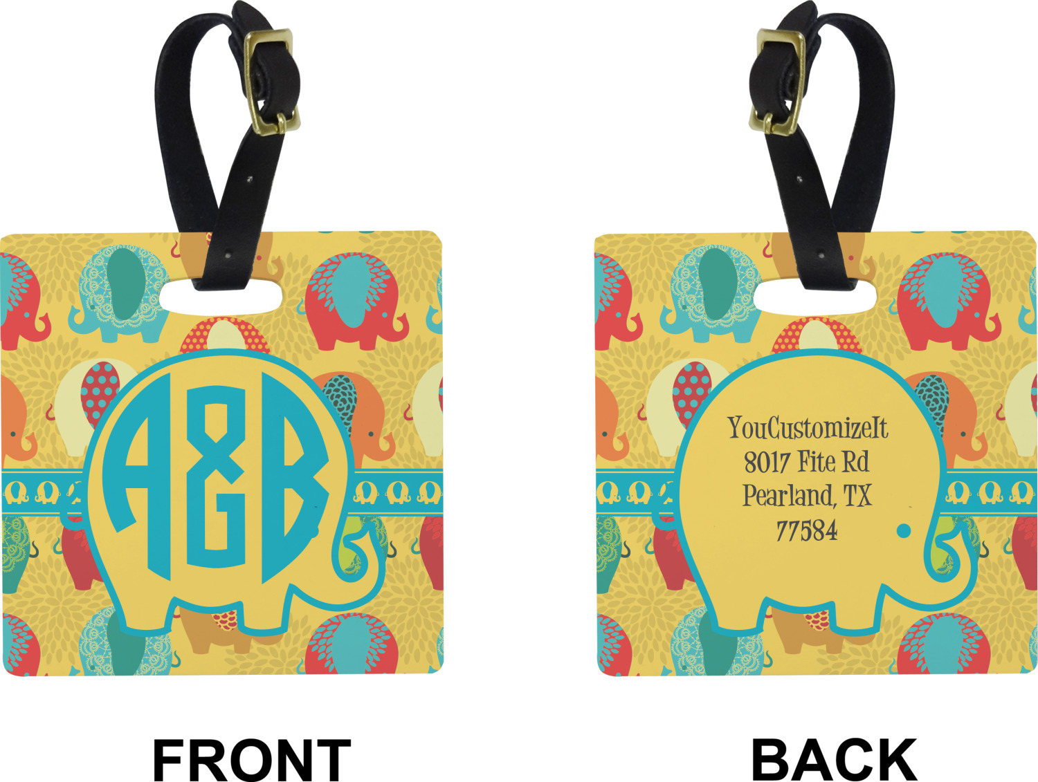 These personalized bag tags are sold in a variety of shapes, so that you may find the product that meets your vision exactly. We sell a round luggage tag, which measures at approximately 4" x 4". Our square luggage tag is about 3.5" x 3.5", while our rectangular version is 2.75" x 4 ".