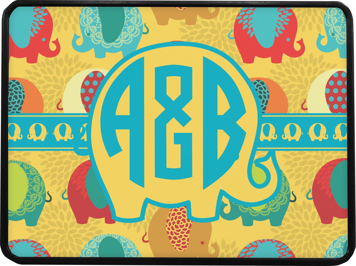 We created a ribbon & label just for this design with the adorable elephants and used them both and coordinated with teal. For the personalization, we chose the round monogram as we thought it looked adorable with the cute elephant label.