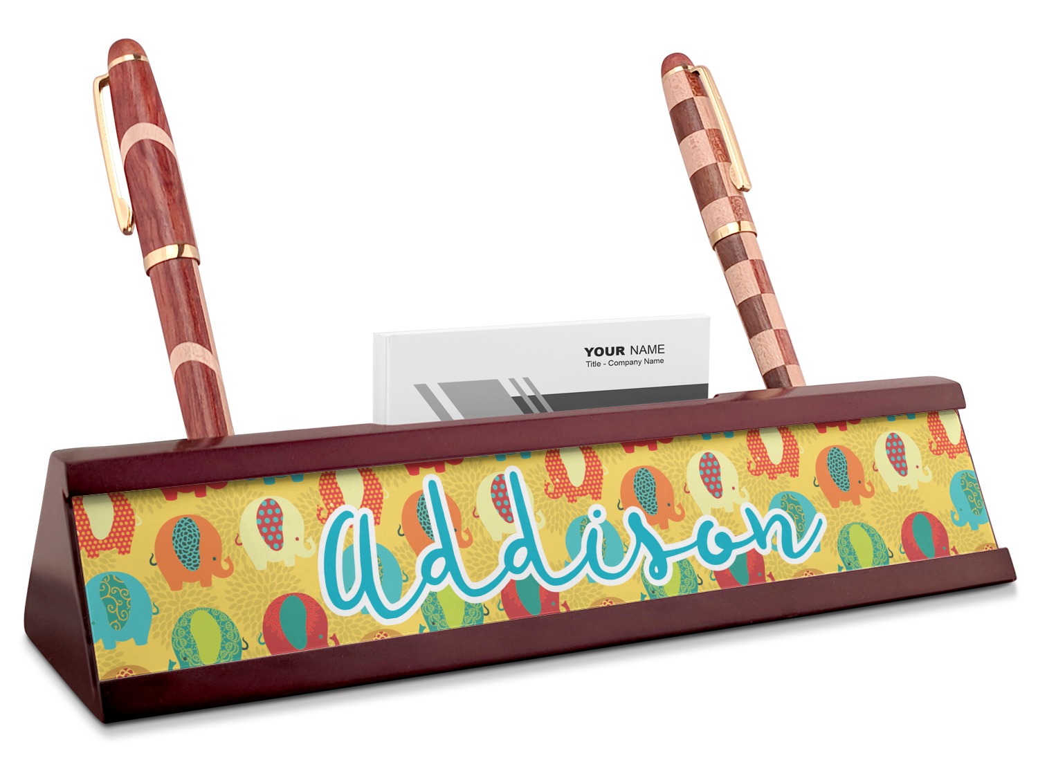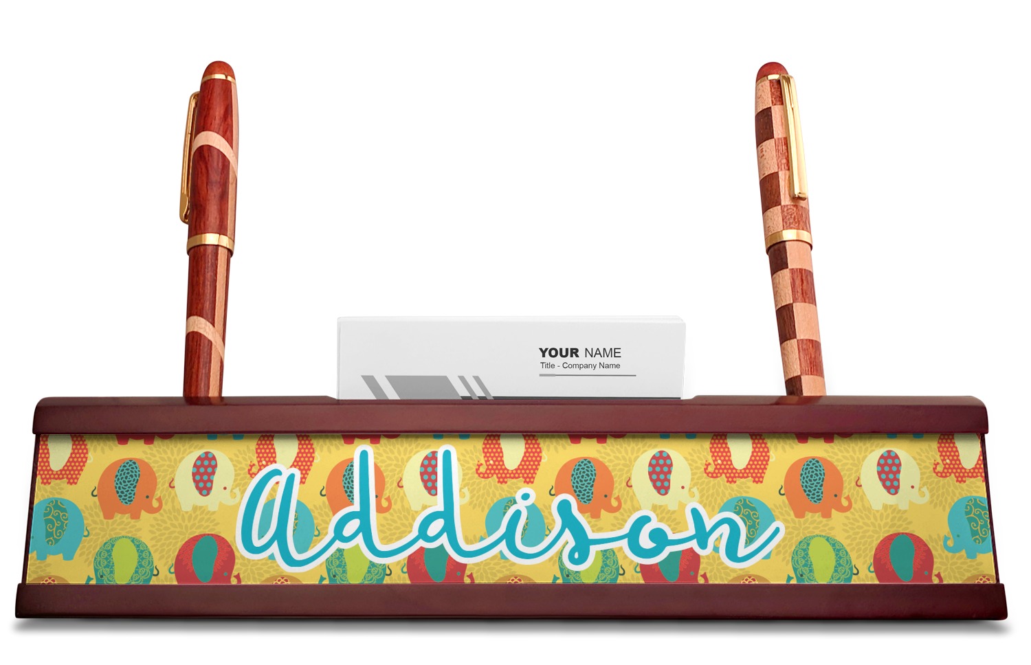 Your desk name plates are crafted from a high-quality, dark-cherry mahogany. At approximately 9.5 by 1.875 by 2.5 inches, this name plaque will fit perfectly, front and center, on your desk. Your customization spans across the entire face of the nameplate. Behind the nameplate lies a skinny slot that can fit approximately 15, traditionally-sized, business cards. You can also store your writing utensils on either side of this custom desk name plate.
