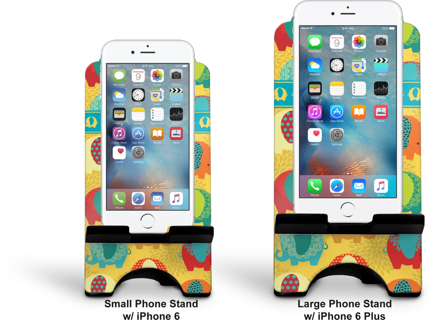 To meet your needs, we offer four variations of this IPhone stand. The backboard of the first version is shaped as a plain, yet sleek rectangle, and is available in two sizes. Our smaller size is approximately 4 by 3.25 by 7 inches, while the larger model is 4 by 3.77 by 8.5 inches. Alongside this model, we also provide you with a more decorative option. The upper part of our second version features a curved edge, for a classy, suave appearance. This phone holder is also sold in two sizes: a smaller version, which is 4 by 3.25 by 7 inches, and our larger model, which is 4 by 3.77 by 8.5 inches. Both models will support large phones, but the larger model is better if you wish to proudly display your personalized design.