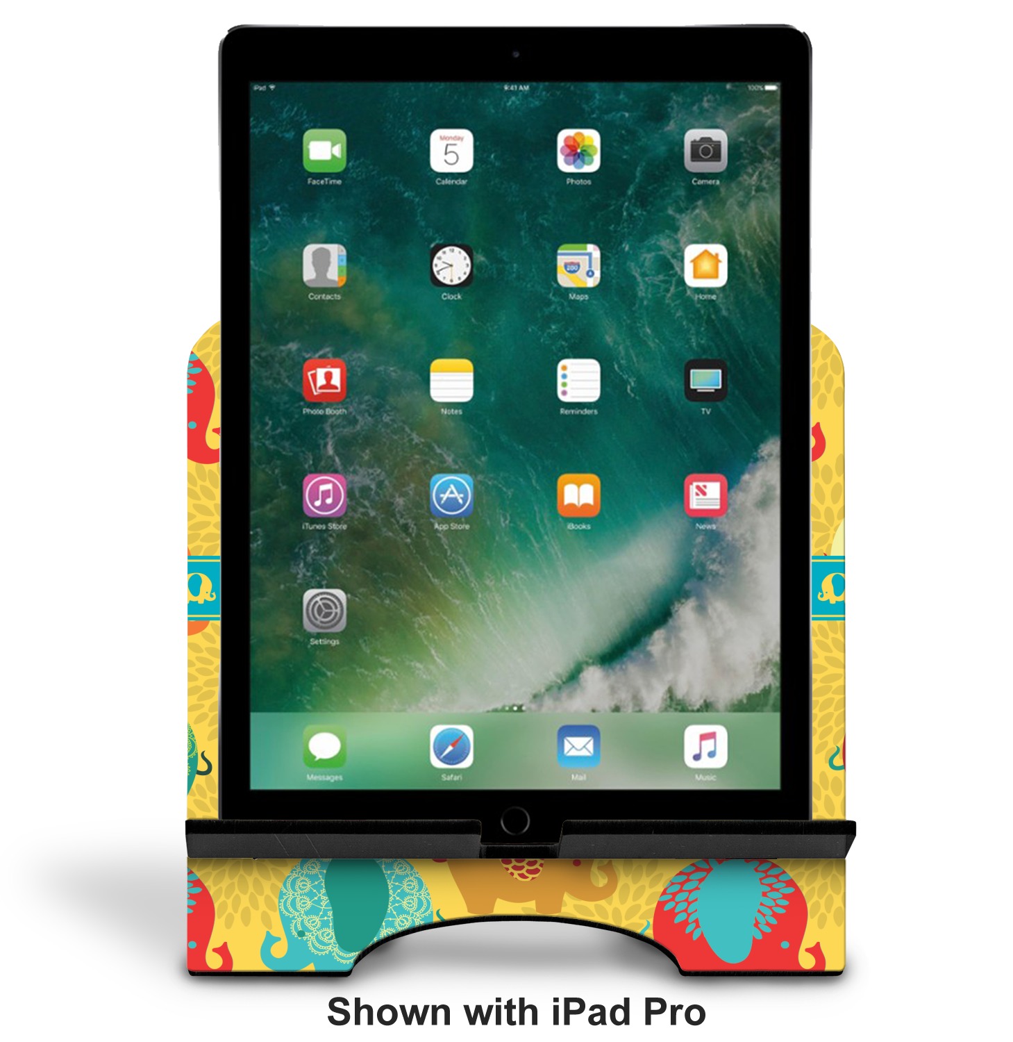 The stand is comprised of two hardboard pieces that fit snugly together and stabilize one another. The bottom part of the iPad stand supports your tablet, and has space for your tablets charger while in use. At 9.25" x 11.5", this tablet mount can support a device between the sizes of the iPad Pro and the iPad Mini 2. The uppermost part of the stand features a decorative, curved edge for a classy, suave appearance. We print your customization atop the face of the stand, in vibrant color. The remaining sides are colored a sleek black.
