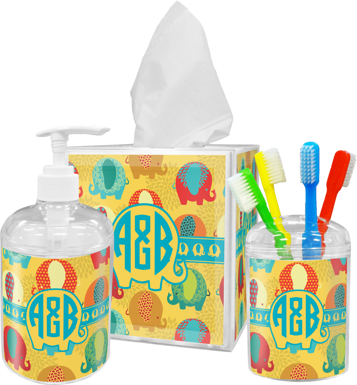 We created a ribbon & label just for this design with the adorable elephants and used them both and coordinated with teal. For the personalization, we chose the round monogram as we thought it looked adorable with the cute elephant label.